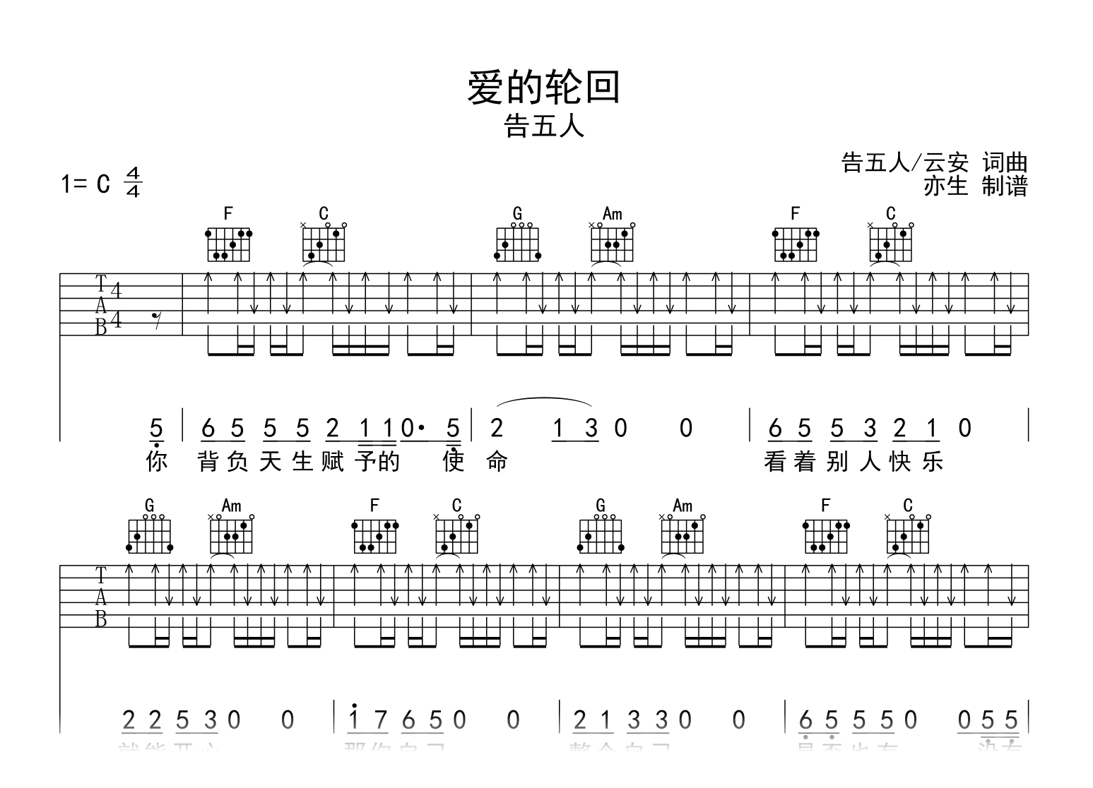 《告五人《爱的轮回吉他谱》(C调)》内容来自于互联网,不能保证内容的准确性与完整性,仅供学习交流欣赏,请勿用于其它用途,内容版权归原作者及来源网站所有,如有侵犯到您的权益请来信告知,我们将及时删除。