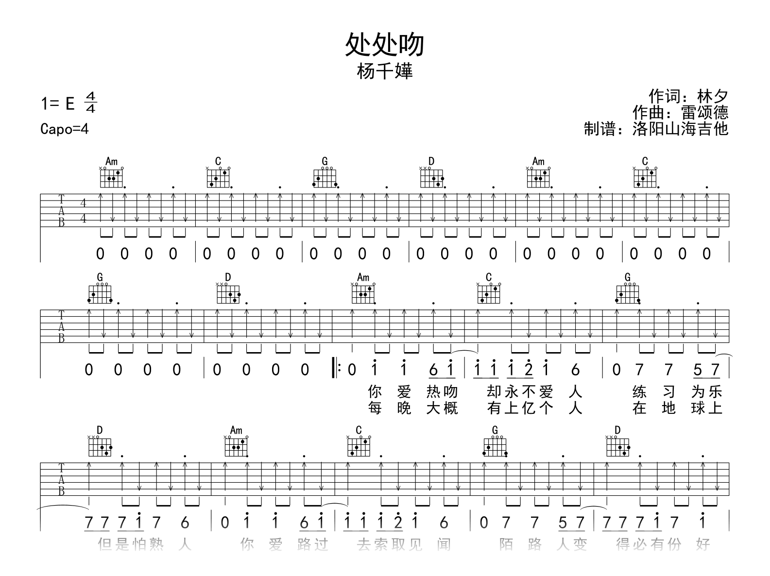《杨千嬅《处处吻吉他谱》(C调)》内容来自于互联网,不能保证内容的准确性与完整性,仅供学习交流欣赏,请勿用于其它用途,内容版权归原作者及来源网站所有,如有侵犯到您的权益请来信告知,我们将及时删除。