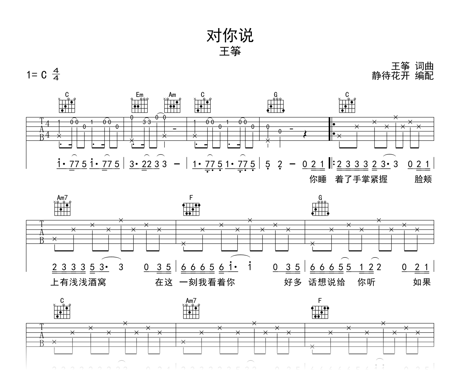 王筝《对你说吉他谱》(C调)