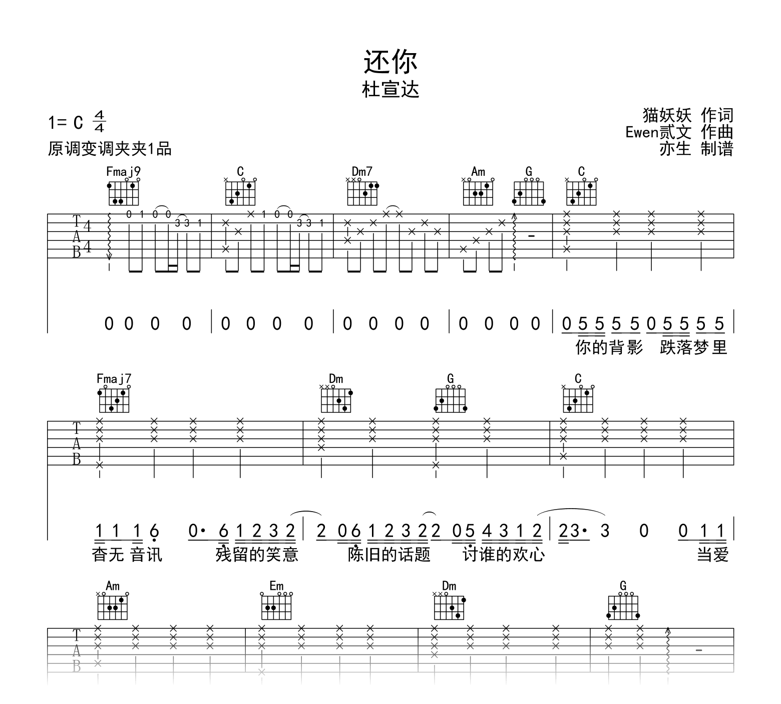 《杜宣达《还你吉他谱》(C调)》内容来自于互联网,不能保证内容的准确性与完整性,仅供学习交流欣赏,请勿用于其它用途,内容版权归原作者及来源网站所有,如有侵犯到您的权益请来信告知,我们将及时删除。