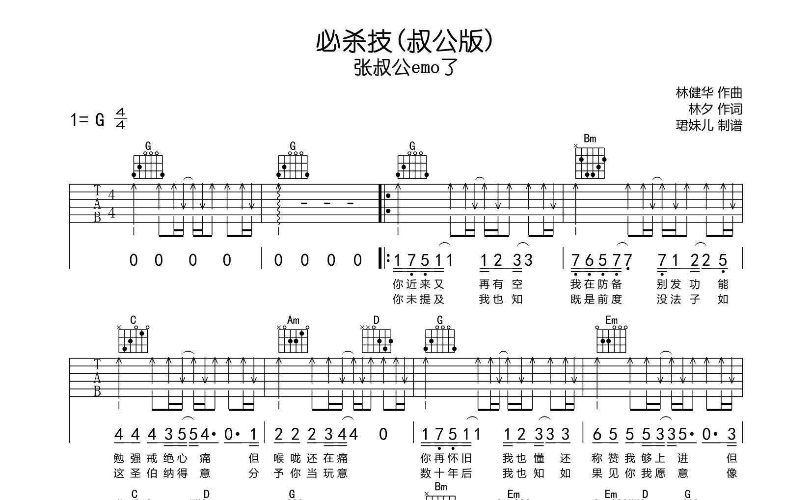 张叔公深情演绎的《必杀技(叔公版)》吉他谱,以G调指法编配,演奏速度为85BPM,难度简单,适合初学者。整谱采用两张高清图片呈现,由制谱者珺妹儿悉心制作并分享。这份吉他弹唱谱充满了张叔公的情感,让人仿佛能感受到他在演唱时的情绪起伏。这是一份不仅技巧易上手,而且
