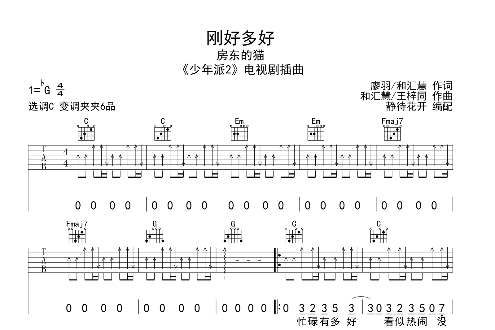 《房东的猫《刚好多好吉他谱》(C调)》内容来自于互联网,不能保证内容的准确性与完整性,仅供学习交流欣赏,请勿用于其它用途,内容版权归原作者及来源网站所有,如有侵犯到您的权益请来信告知,我们将及时删除。