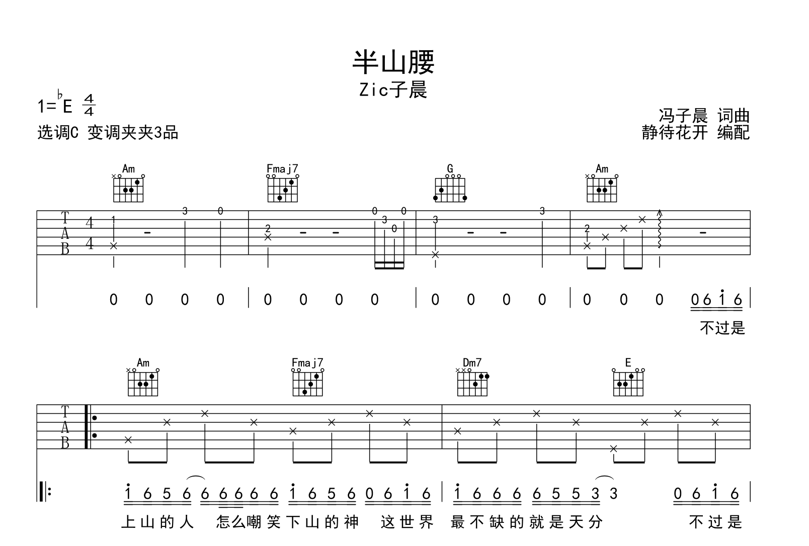 这首歌曲是由@静待花开编配扒谱制作的半山腰吉他谱,由zic子晨演唱。采用C调和弦指法编配,推荐使用变调夹夹在第3品演奏,原调为bE调,也可根据个人嗓音条件选择变调夹位置。演奏速度建议控制在每分钟85拍左右,整体难度较为简单。这份谱子呈现了一种温暖和谐的氛围,适