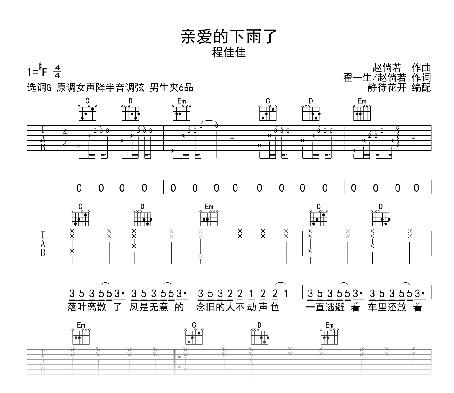 《程佳佳《亲爱的下雨了吉他谱》(C调)》内容来自于互联网,不能保证内容的准确性与完整性,仅供学习交流欣赏,请勿用于其它用途,内容版权归原作者及来源网站所有,如有侵犯到您的权益请来信告知,我们将及时删除。