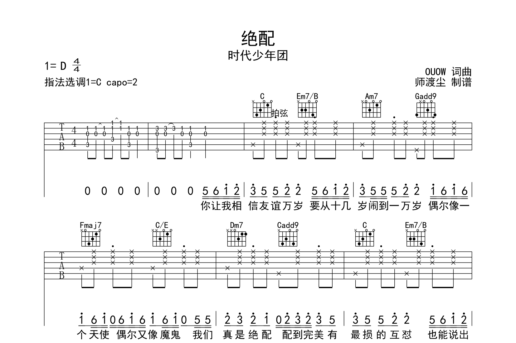《时代少年团《绝配吉他谱》(C调)》内容来自于互联网,不能保证内容的准确性与完整性,仅供学习交流欣赏,请勿用于其它用途,内容版权归原作者及来源网站所有,如有侵犯到您的权益请来信告知,我们将及时删除。