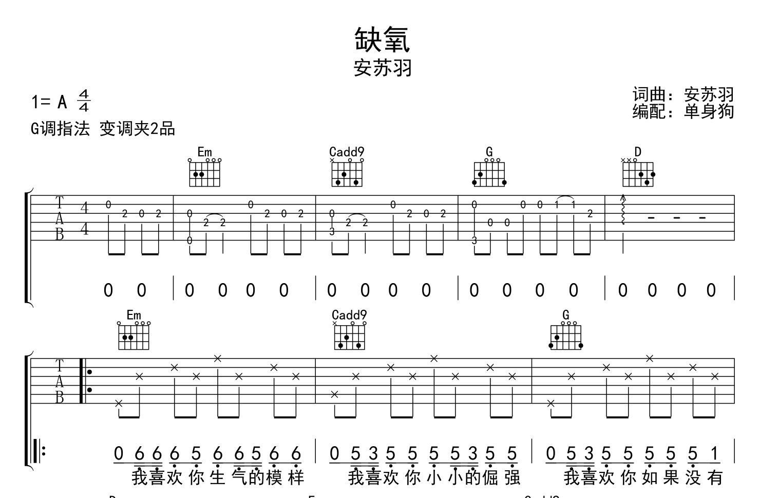 《安苏羽《缺氧吉他谱》(G调)》内容来自于互联网,不能保证内容的准确性与完整性,仅供学习交流欣赏,请勿用于其它用途,内容版权归原作者及来源网站所有,如有侵犯到您的权益请来信告知,我们将及时删除。