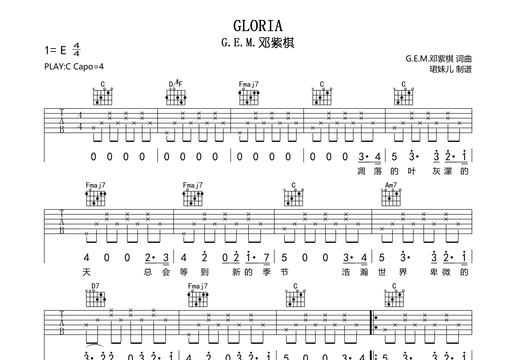 《邓紫棋《GLORIA吉他谱》(C调)》内容来自于互联网,不能保证内容的准确性与完整性,仅供学习交流欣赏,请勿用于其它用途,内容版权归原作者及来源网站所有,如有侵犯到您的权益请来信告知,我们将及时删除。