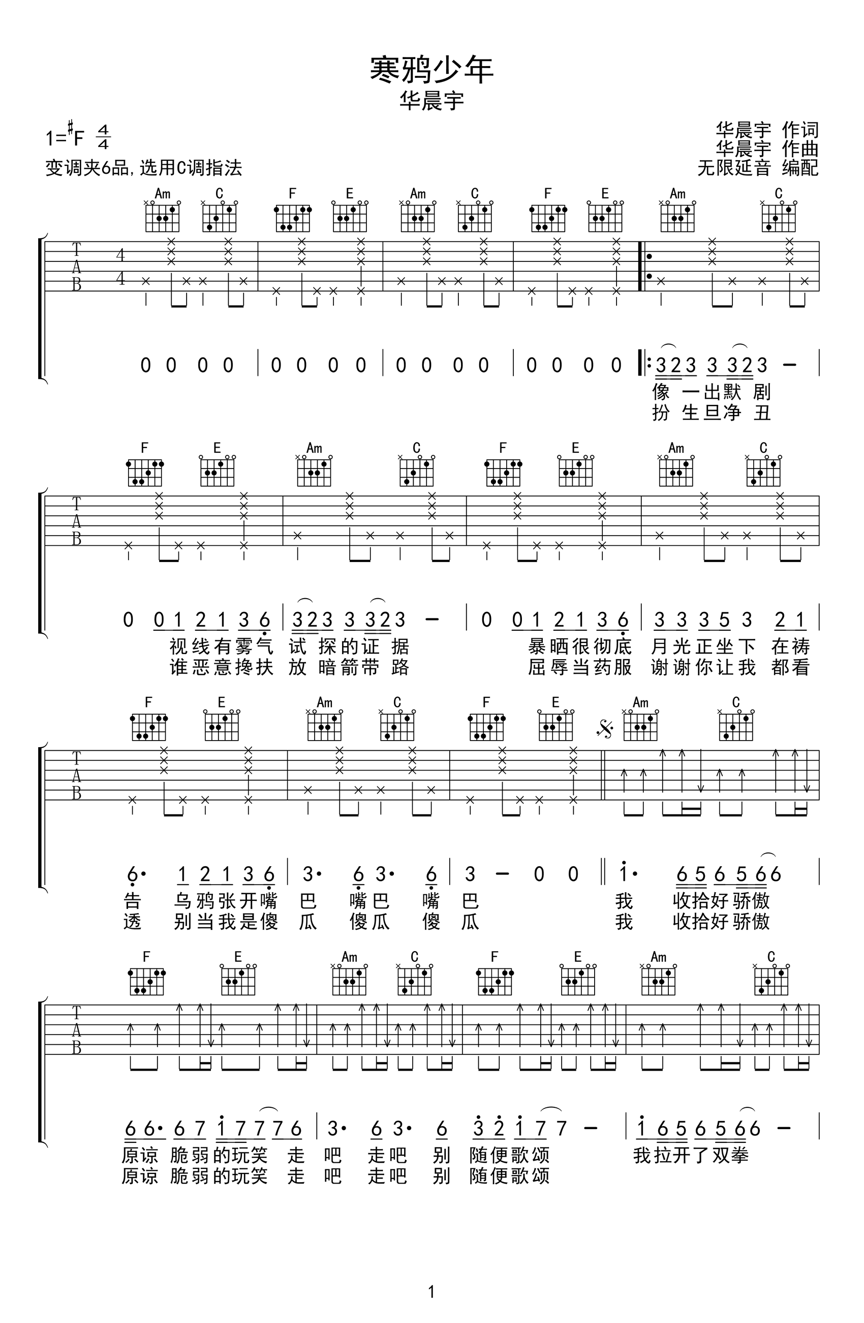 《华晨宇《寒鸦少年吉他谱》(C调)》内容来自于互联网,不能保证内容的准确性与完整性,仅供学习交流欣赏,请勿用于其它用途,内容版权归原作者及来源网站所有,如有侵犯到您的权益请来信告知,我们将及时删除。