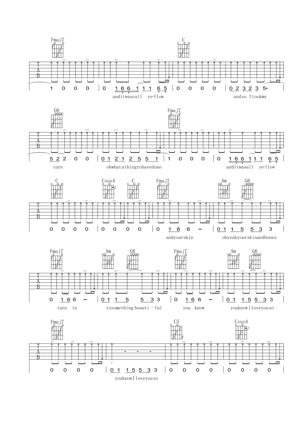 《《Yellow 酷玩乐队 C调吉他谱》(C调)》内容来自于互联网,不能保证内容的准确性与完整性,仅供学习交流欣赏,请勿用于其它用途,内容版权归原作者及来源网站所有,如有侵犯到您的权益请来信告知,我们将及时删除。