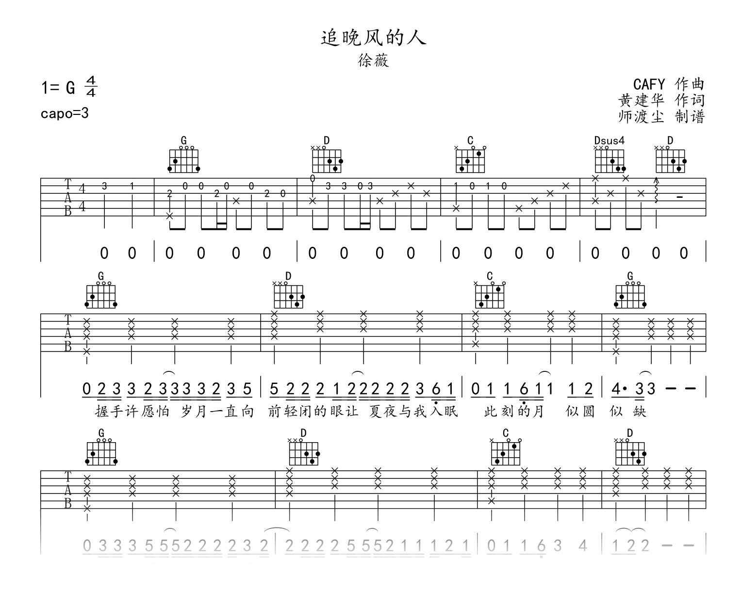 《徐薇《追晚风的人吉他谱》(G调)》内容来自于互联网,不能保证内容的准确性与完整性,仅供学习交流欣赏,请勿用于其它用途,内容版权归原作者及来源网站所有,如有侵犯到您的权益请来信告知,我们将及时删除。