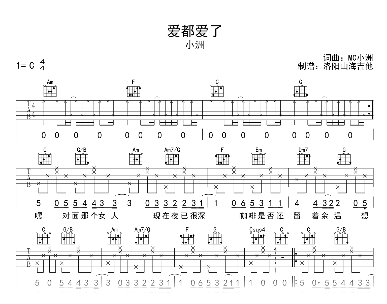 《小洲《爱都爱了吉他谱》(C调)》内容来自于互联网,不能保证内容的准确性与完整性,仅供学习交流欣赏,请勿用于其它用途,内容版权归原作者及来源网站所有,如有侵犯到您的权益请来信告知,我们将及时删除。