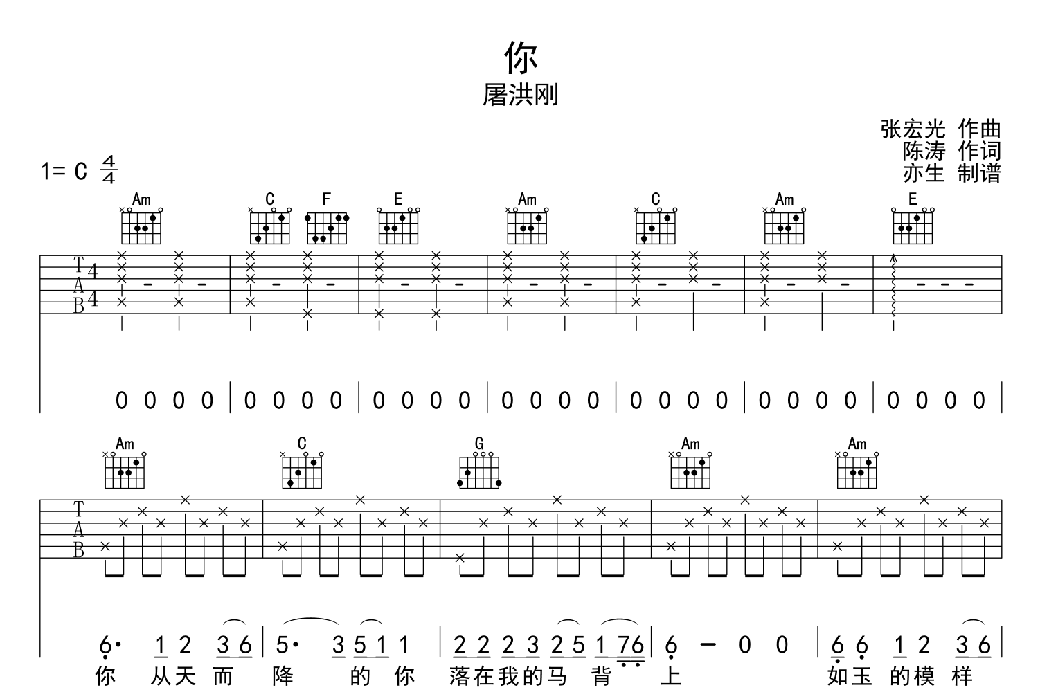 屠洪刚《你吉他谱》(C调)