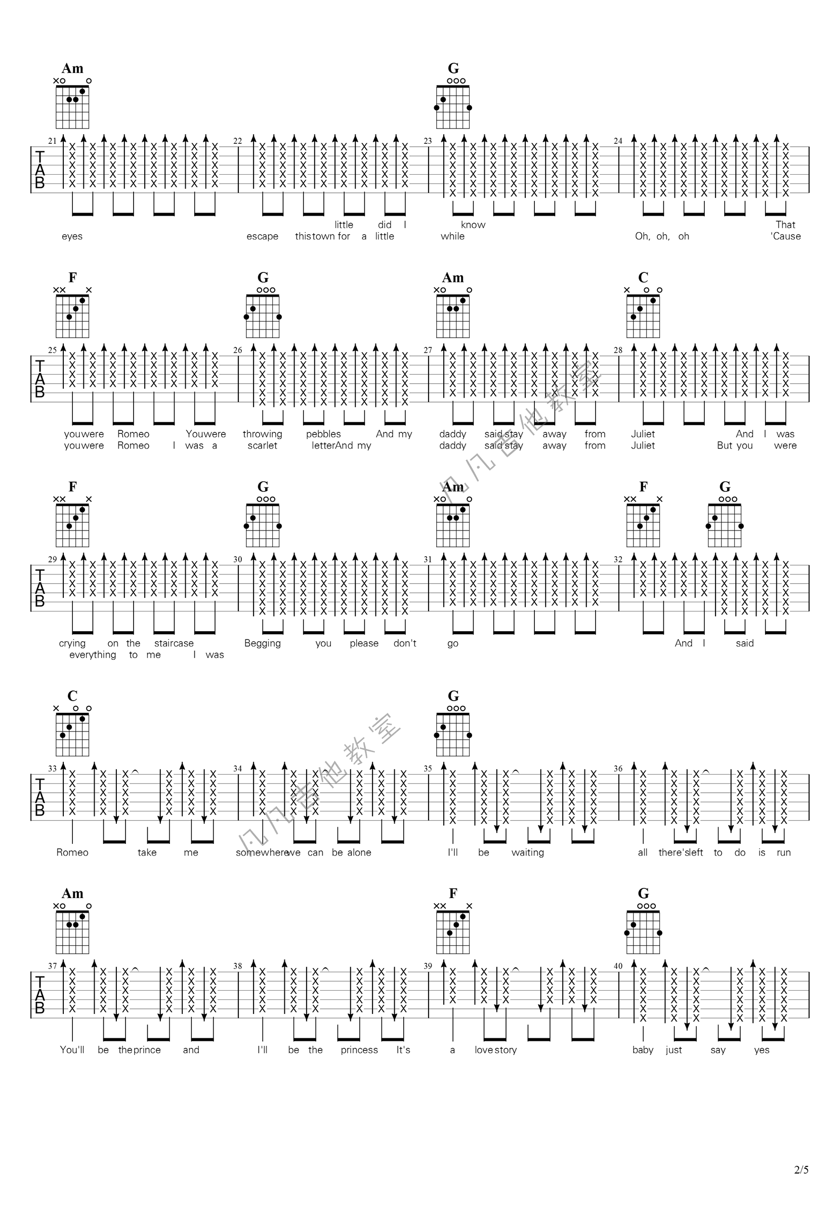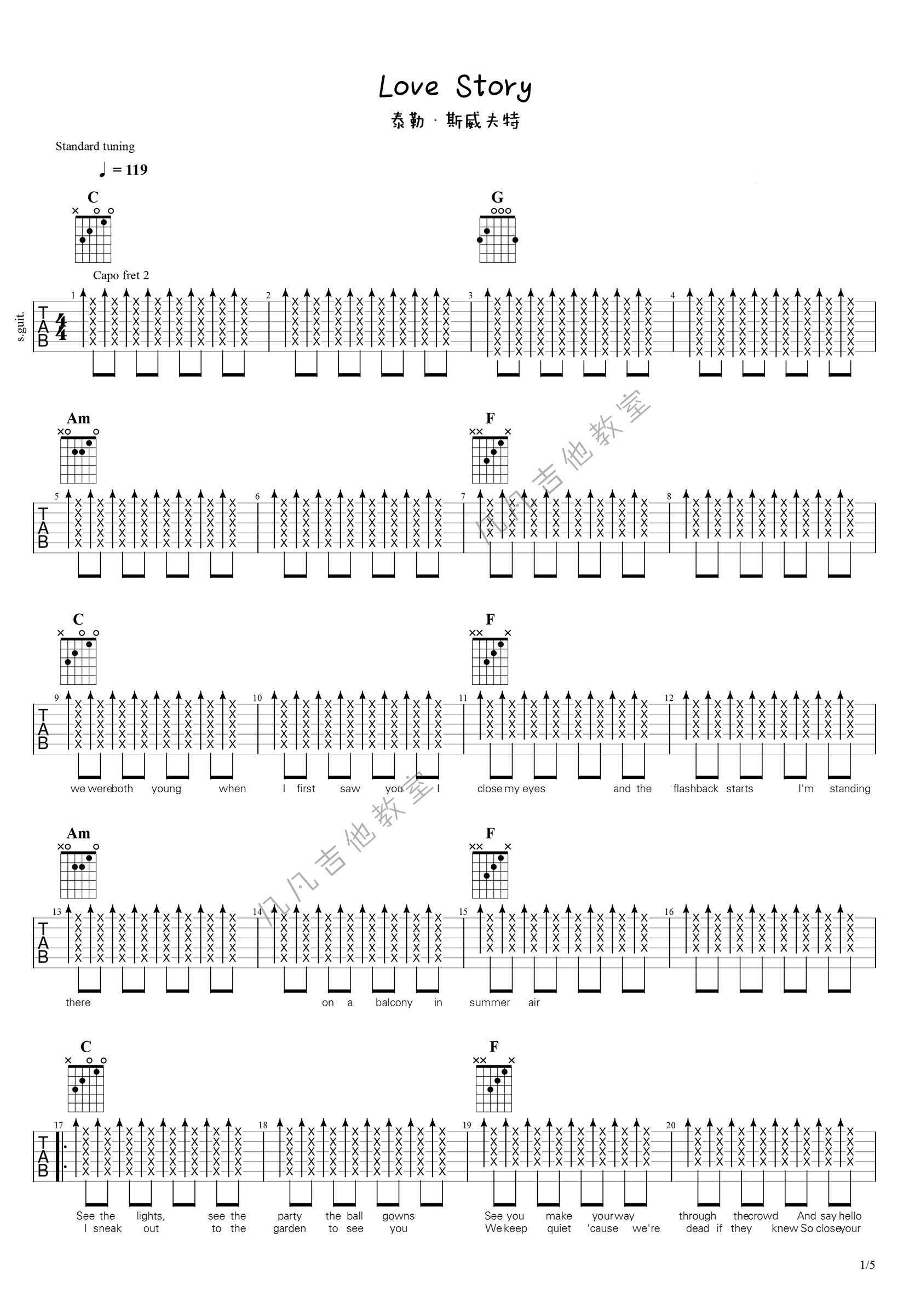 Taylor Swift演唱的经典乡村民谣《Love Story》的吉他谱包含完整的高清六线谱,以及闷音扫弦编配。附带演示视频,琴友们可跟随示范进行练习。谱中需注意两个难点,一是英文连读,二是歌曲的节奏。学习者需逐句梳理连读和掌握歌曲的韵律,尤其在长句部分,借