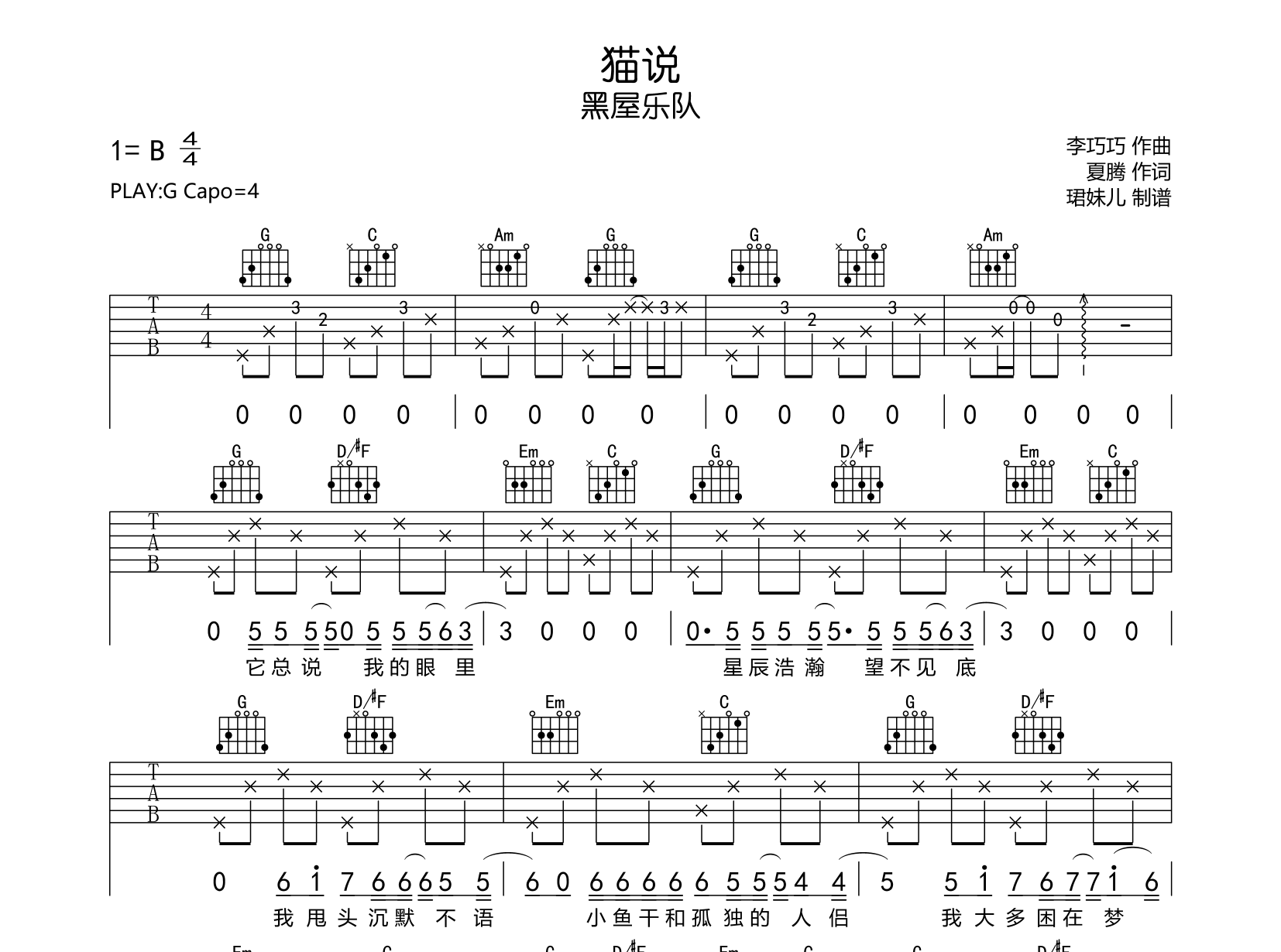 黑屋乐队的歌曲《猫说》有一份由珺妹儿制作的吉他谱,采用G调指法编排。建议使用变调夹放在4品,演奏速度为85BPM,难度较为简单,适合初学者。这份谱共分为3张高清图片,以图文混排的形式呈现。