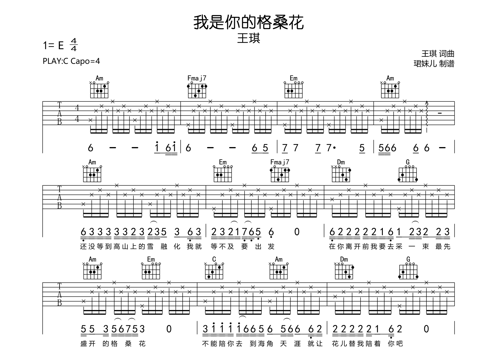 《王琪《我是你的格桑花吉他谱》(C调)》内容来自于互联网,不能保证内容的准确性与完整性,仅供学习交流欣赏,请勿用于其它用途,内容版权归原作者及来源网站所有,如有侵犯到您的权益请来信告知,我们将及时删除。