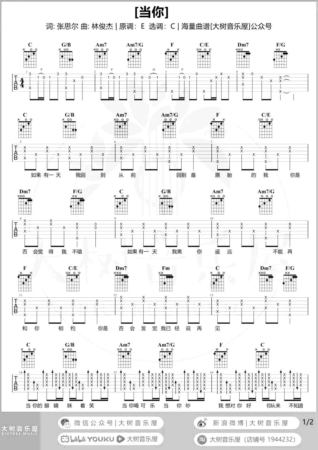 《林俊杰《当你吉他谱》(C调)》内容来自于互联网,不能保证内容的准确性与完整性,仅供学习交流欣赏,请勿用于其它用途,内容版权归原作者及来源网站所有,如有侵犯到您的权益请来信告知,我们将及时删除。