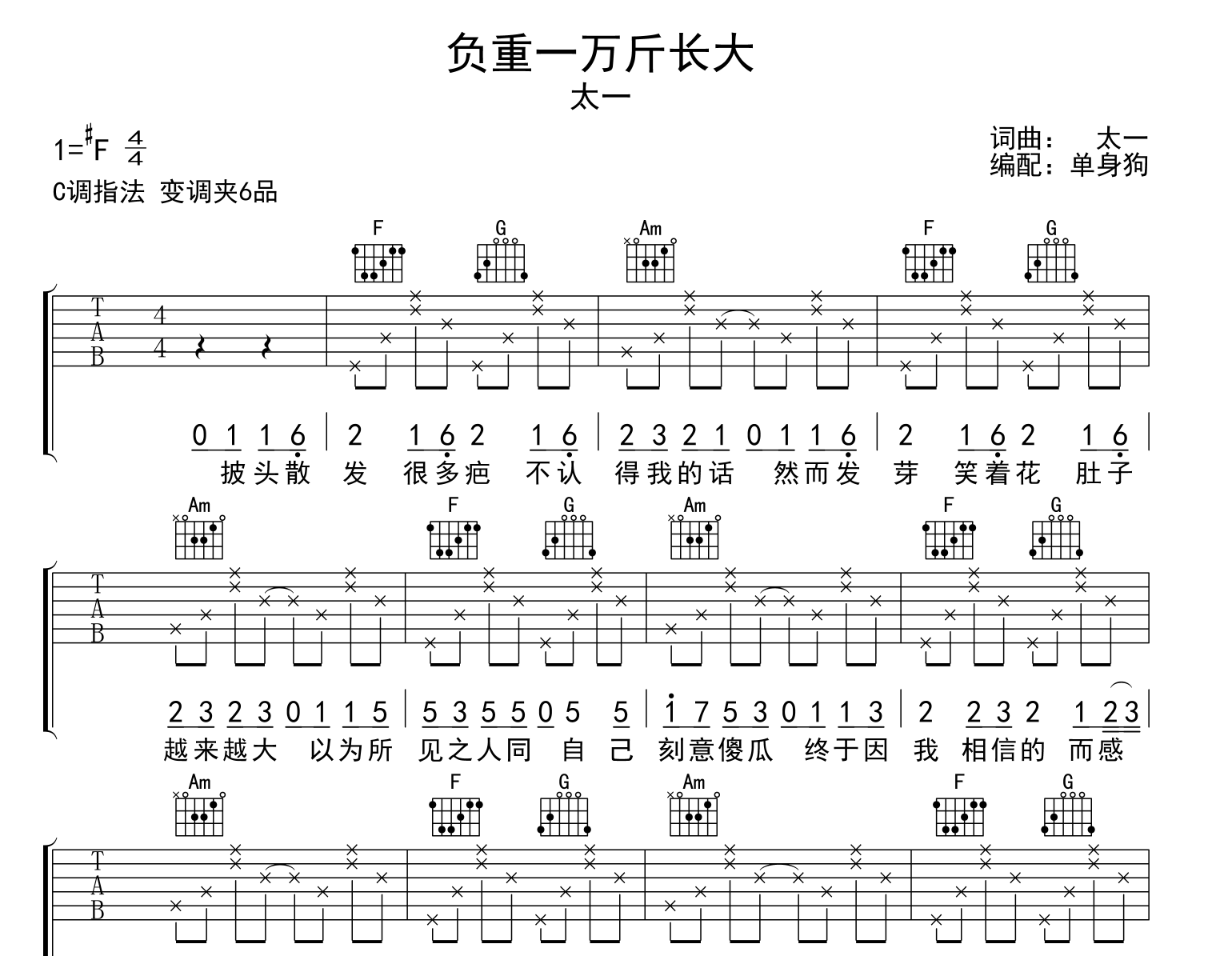 这首歌曲是由太一演唱,名为《负重一万斤》。它采用了C调指法编配,原调#F,但可以弹回原调,需要使用CAPO夹在第6品位上。曲谱由单身狗制作,提供了4张高清PNG图片谱例,以帮助吉他手学习这首歌曲。这首歌的曲谱包括了吉他手需要的关键信息,以便演奏这首动人的歌曲。