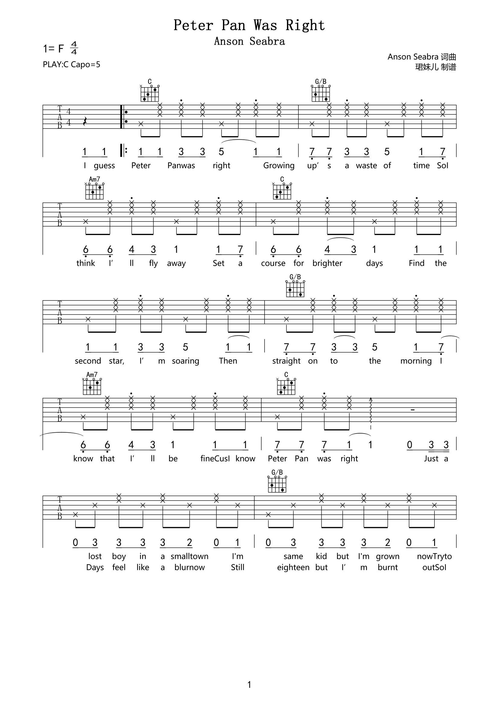 Anson Seabra演唱的《Peter Pan Was Right》是一首珍贵的英文歌曲,吉他谱以温暖治愈的磁性歌声为特点。原调F,采用C调指法编排,使用CAPO夹五品。演奏速度为95BPM,谱子简单易学,适合初学者上手。这首歌以其迷人旋律和动人歌词,仿佛