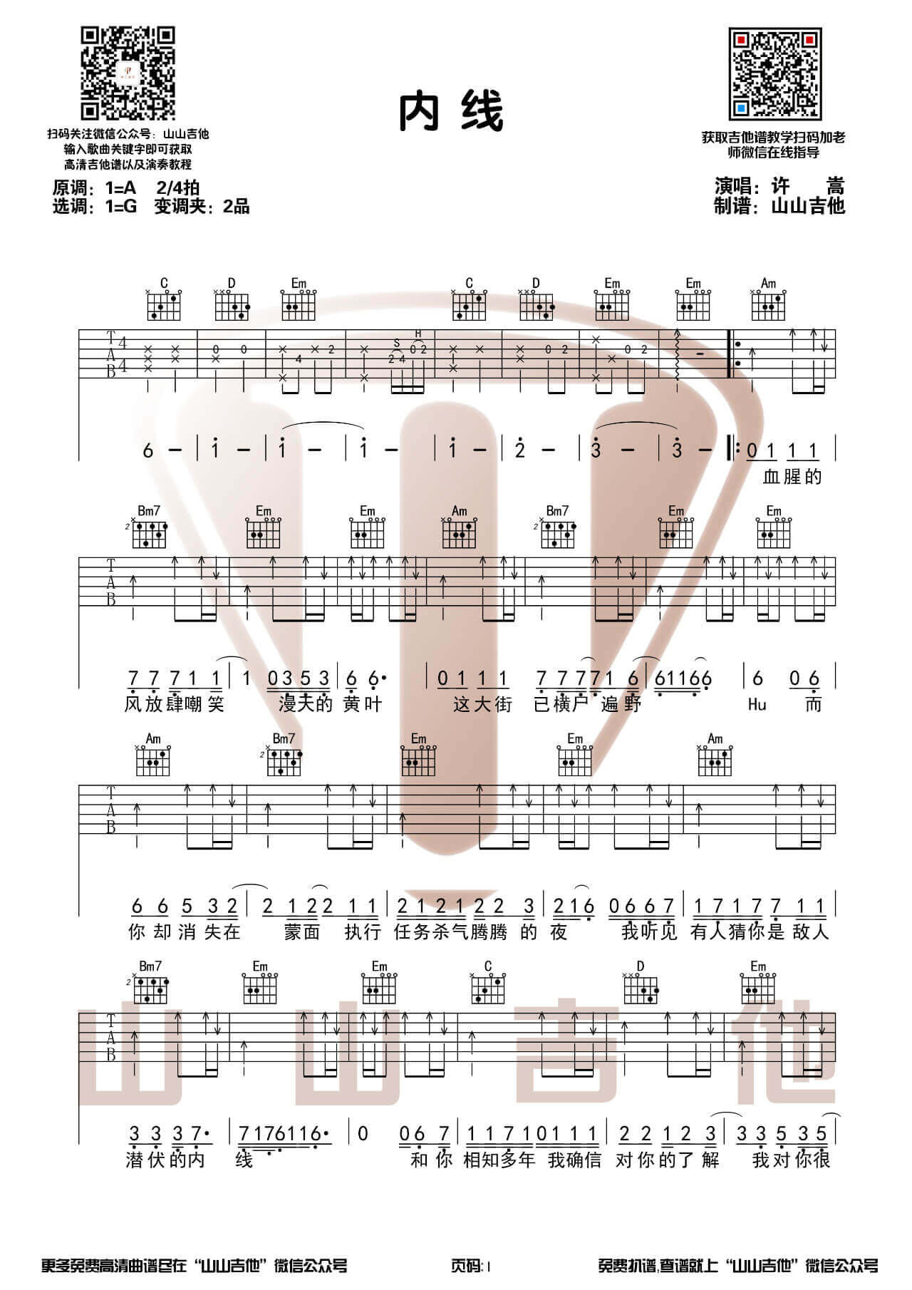 《许嵩《内线吉他谱》》内容来自于互联网,不能保证内容的准确性与完整性,仅供学习交流欣赏,请勿用于其它用途,内容版权归原作者及来源网站所有,如有侵犯到您的权益请来信告知,我们将及时删除。