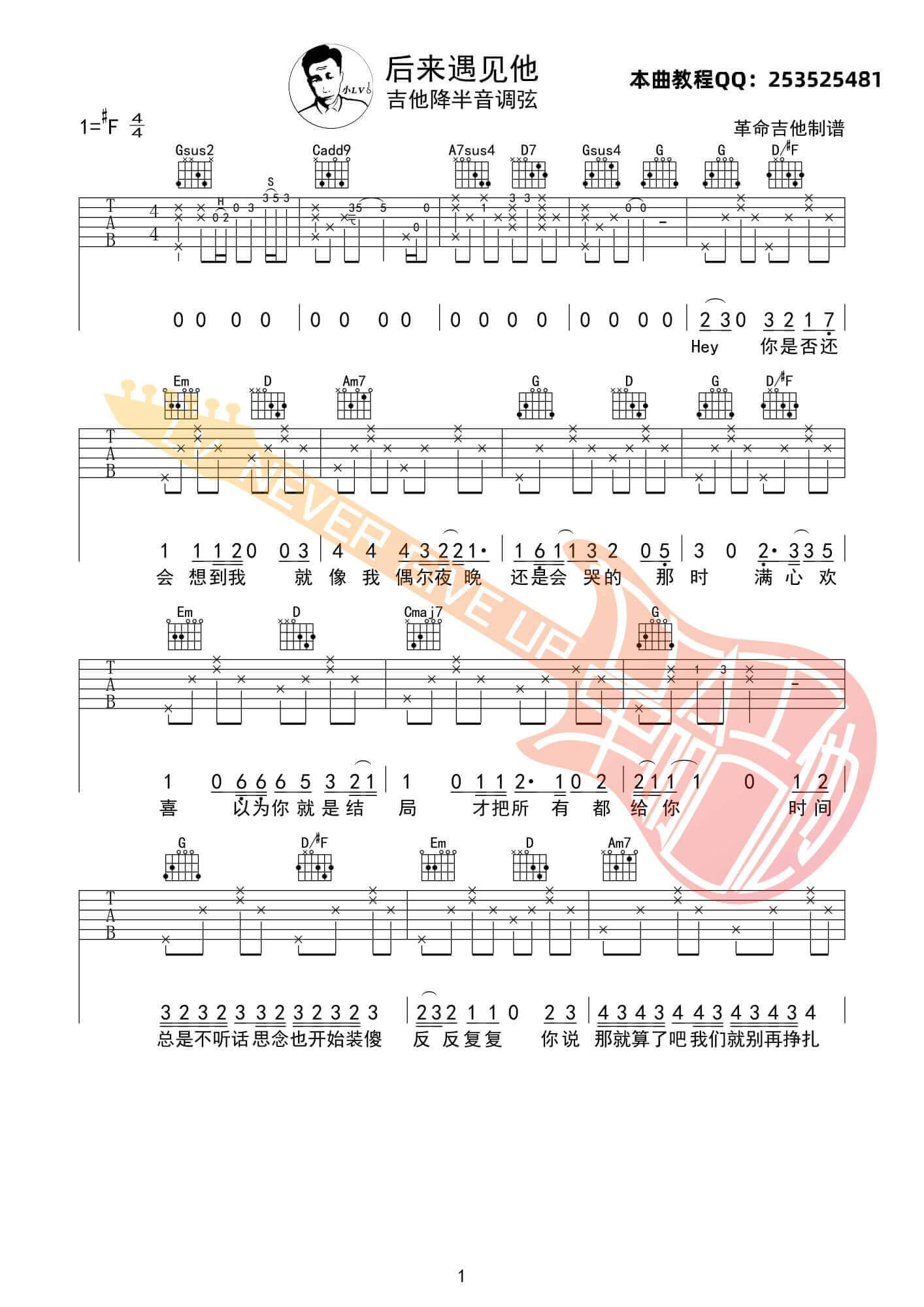 《《后来遇见他吉他谱》(F调)》内容来自于互联网,不能保证内容的准确性与完整性,仅供学习交流欣赏,请勿用于其它用途,内容版权归原作者及来源网站所有,如有侵犯到您的权益请来信告知,我们将及时删除。
