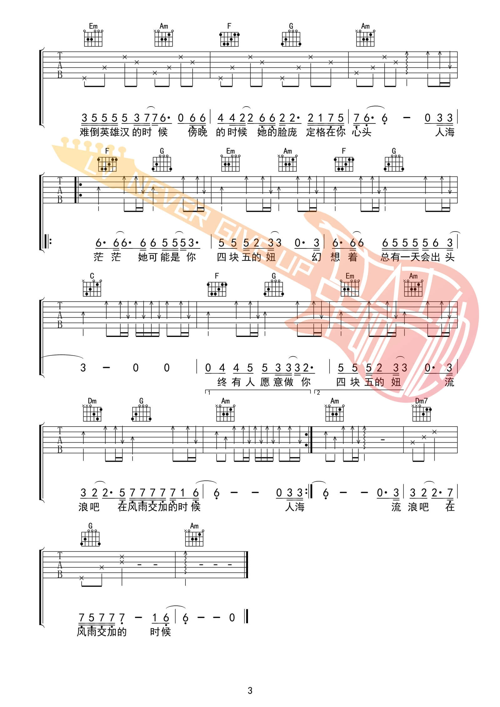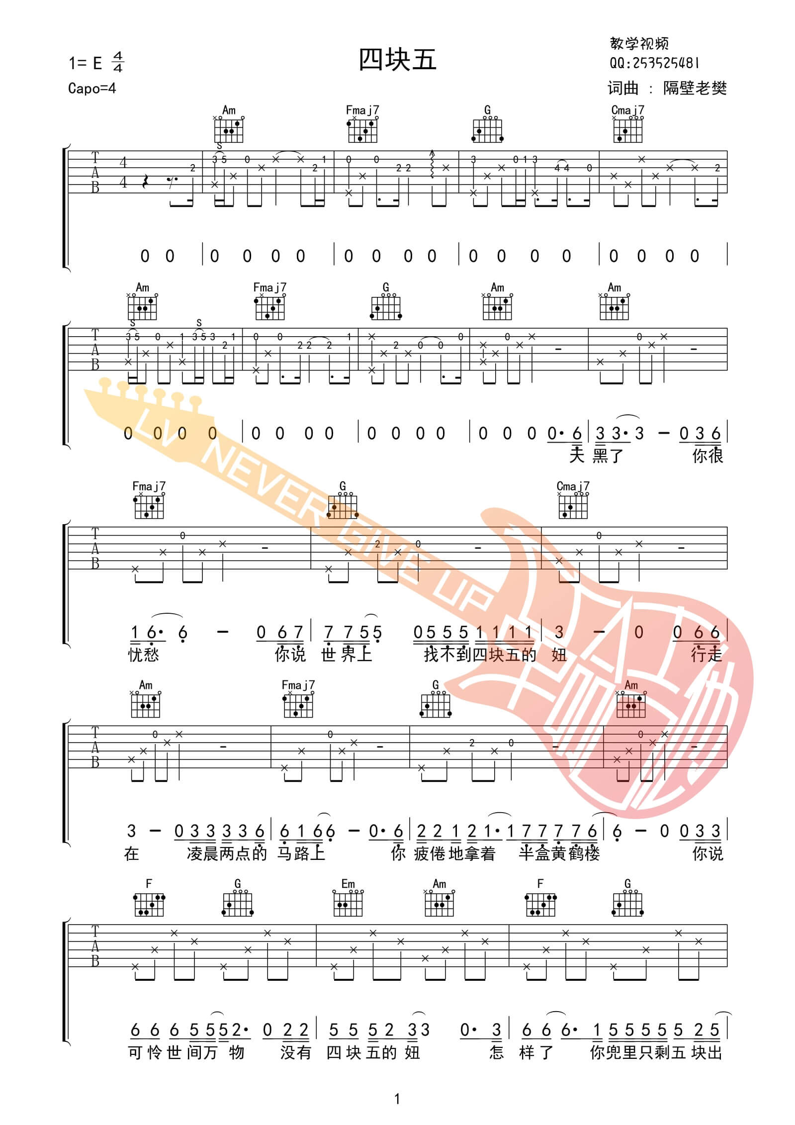 《隔壁老樊《四块五吉他谱》(E调)》内容来自于互联网,不能保证内容的准确性与完整性,仅供学习交流欣赏,请勿用于其它用途,内容版权归原作者及来源网站所有,如有侵犯到您的权益请来信告知,我们将及时删除。