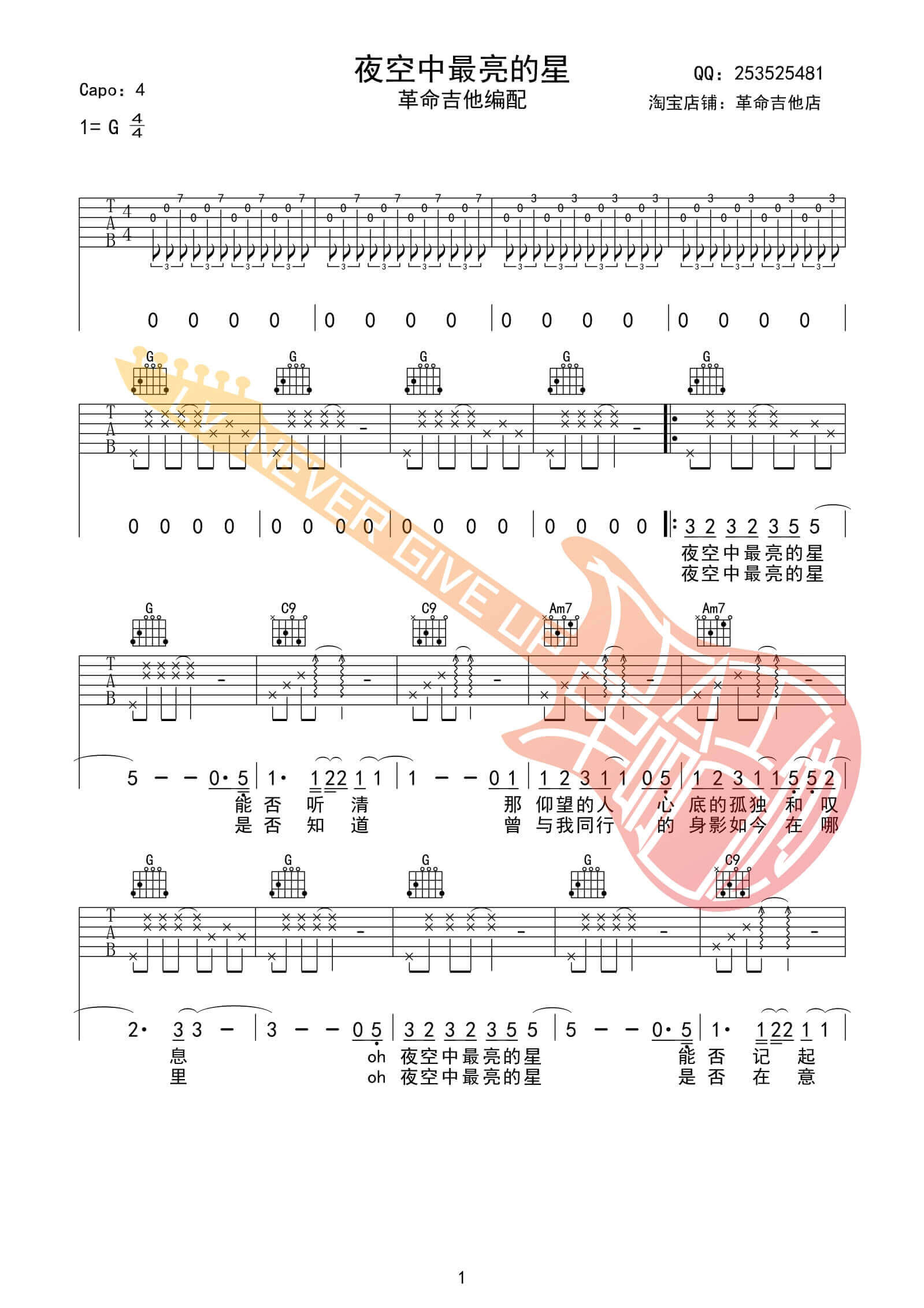 《夜空中最亮的星》吉他曲谱采用G调指法,由革命吉他编排制作。这首歌赋予我们强大的力量,勉励我们追逐梦想,勇往直前。通过这首歌,青春的梦想、年轻的勇气和决心传递给了每颗年轻的心,点燃了热情。每次听到这首歌,都让我们感受到那些坚守梦想、理想的人们带来的激励和感动。