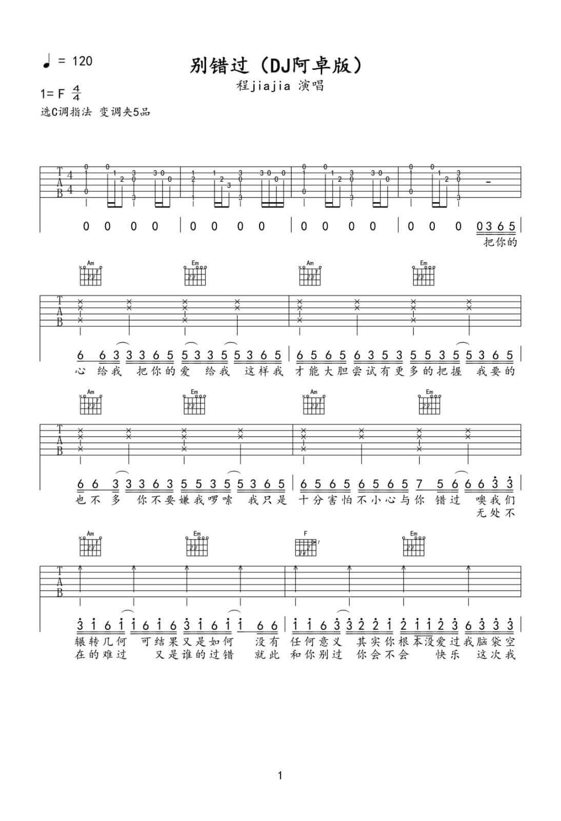 《别错过》吉他谱以C调为基础,由程jiajia创作并演唱,于2021年2月1日发布。这首抖音热门歌曲在DJ阿卓的改编中以F调为原调,使用变调夹5品,提供了两张六线谱图片。歌曲情感深沉,歌词表达了在感情中的挫折与无助,展现了程jiajia悦耳动听的声音。歌词呼唤