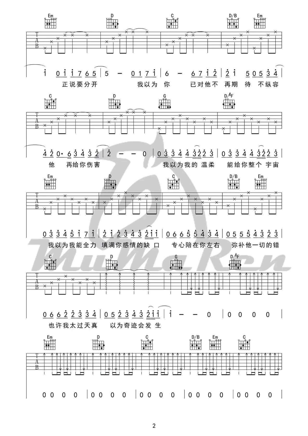 这首歌曲的吉他谱由牧马人乐器编配完成,采用G调指法。由品冠演唱的这首歌曲经久不衰,尤其在九零后的一代人中广为人知。它的旋律非常动听,尤其副歌部分的“我以为”歌词让人难以忘怀,具有极高的传唱度。这首歌曲的旋律贴合大众听觉,因此备受欢迎。歌词深刻地描述了单恋者的内