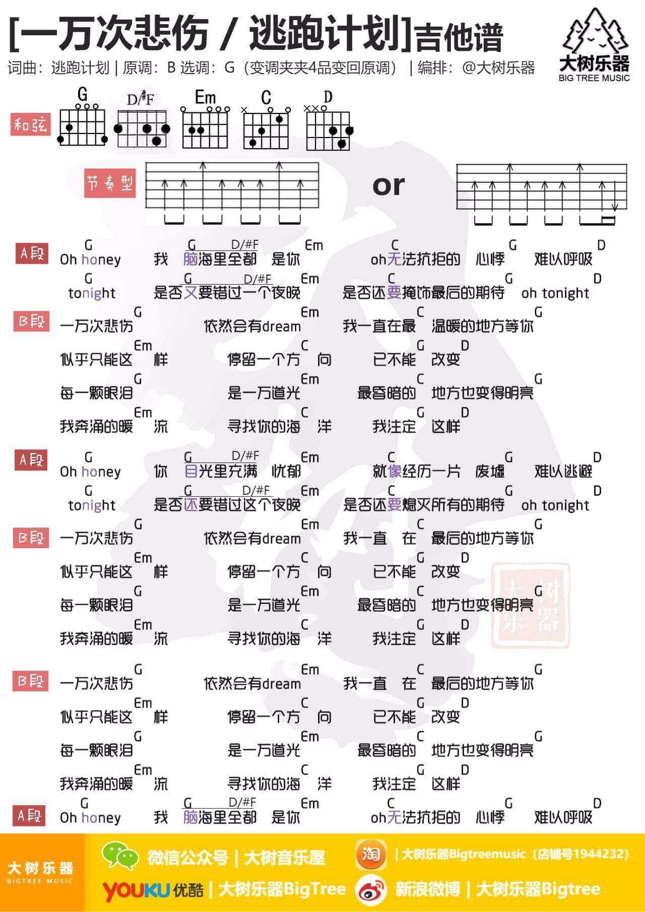 逃跑计划《一万次悲伤吉他谱》(G调)