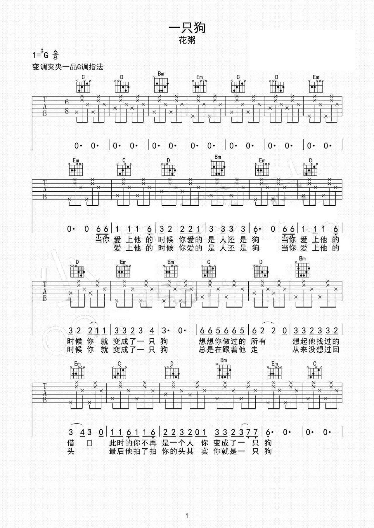 《花粥《一只狗吉他谱》(G调)》内容来自于互联网,不能保证内容的准确性与完整性,仅供学习交流欣赏,请勿用于其它用途,内容版权归原作者及来源网站所有,如有侵犯到您的权益请来信告知,我们将及时删除。