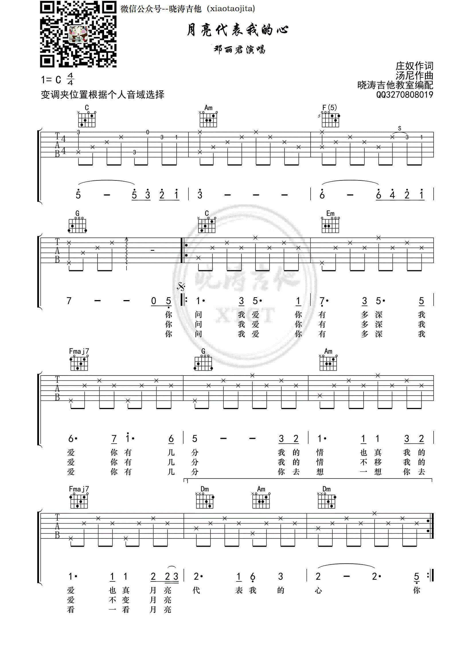 《邓丽君《月亮代表我的心吉他谱》(C调)》内容来自于互联网,不能保证内容的准确性与完整性,仅供学习交流欣赏,请勿用于其它用途,内容版权归原作者及来源网站所有,如有侵犯到您的权益请来信告知,我们将及时删除。