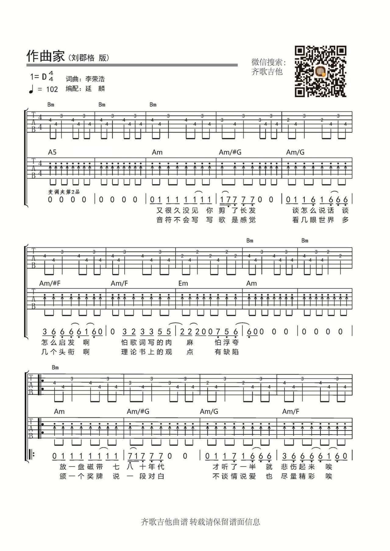 《李荣浩《作曲家吉他谱》(D调)》内容来自于互联网,不能保证内容的准确性与完整性,仅供学习交流欣赏,请勿用于其它用途,内容版权归原作者及来源网站所有,如有侵犯到您的权益请来信告知,我们将及时删除。