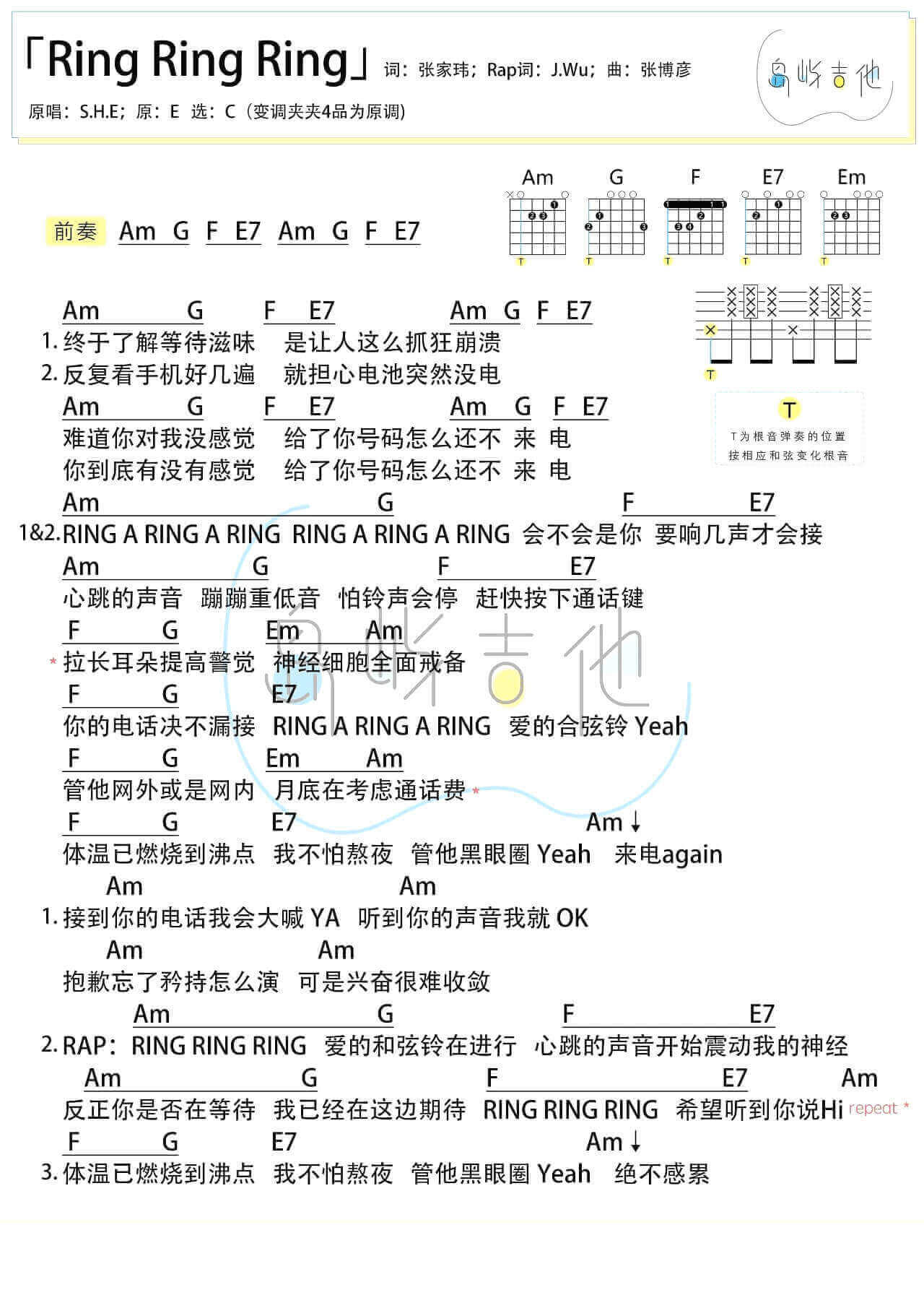 《S.H.E《ring ring ring吉他谱》(C调)》内容来自于互联网,不能保证内容的准确性与完整性,仅供学习交流欣赏,请勿用于其它用途,内容版权归原作者及来源网站所有,如有侵犯到您的权益请来信告知,我们将及时删除。