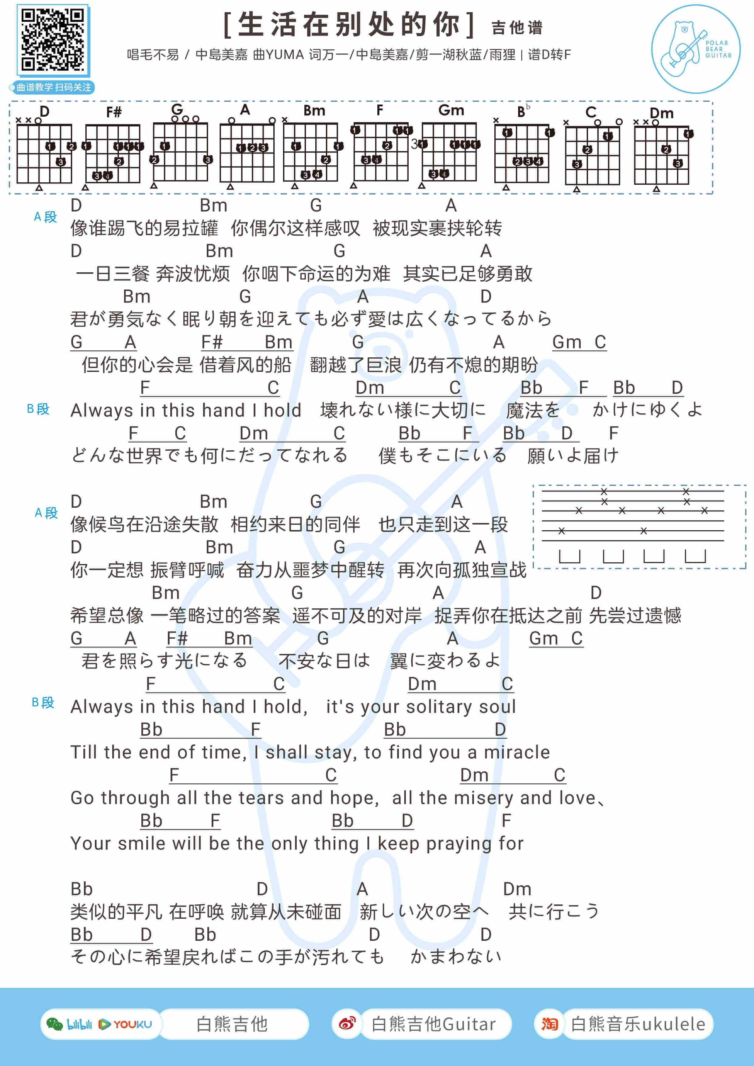 《毛不易《生活在别处的你吉他谱》》内容来自于互联网,不能保证内容的准确性与完整性,仅供学习交流欣赏,请勿用于其它用途,内容版权归原作者及来源网站所有,如有侵犯到您的权益请来信告知,我们将及时删除。