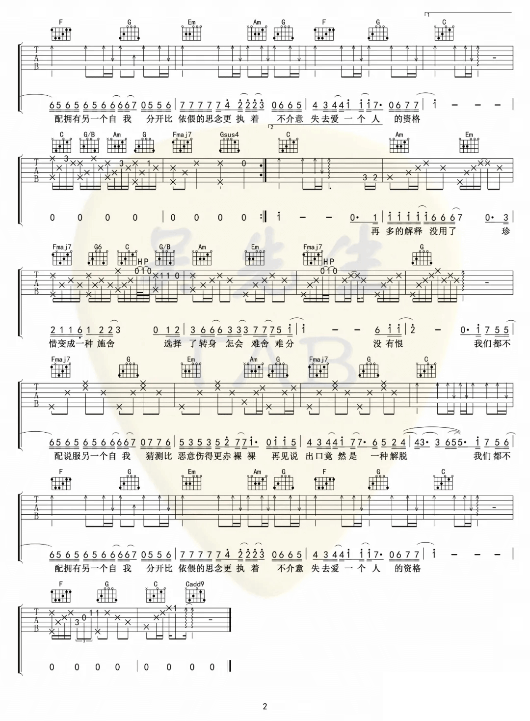 《颜人中《不舍吉他谱》(C调)》内容来自于互联网,不能保证内容的准确性与完整性,仅供学习交流欣赏,请勿用于其它用途,内容版权归原作者及来源网站所有,如有侵犯到您的权益请来信告知,我们将及时删除。