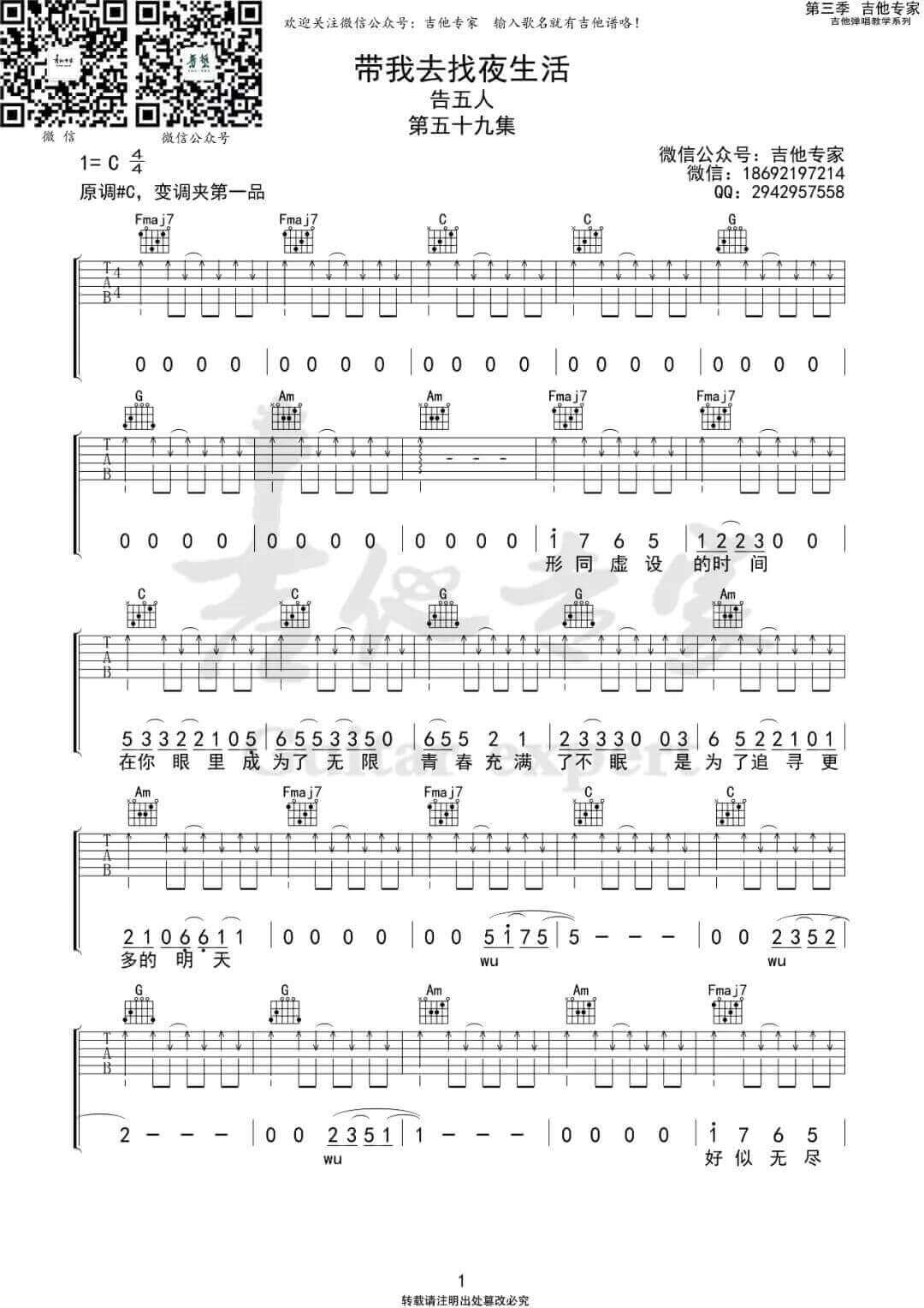 《告五人《带我去找夜生活吉他谱》(C调)》内容来自于互联网,不能保证内容的准确性与完整性,仅供学习交流欣赏,请勿用于其它用途,内容版权归原作者及来源网站所有,如有侵犯到您的权益请来信告知,我们将及时删除。