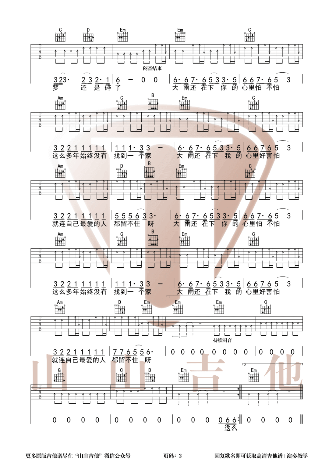 《赵照《大雨还在下吉他谱》(G调)》内容来自于互联网,不能保证内容的准确性与完整性,仅供学习交流欣赏,请勿用于其它用途,内容版权归原作者及来源网站所有,如有侵犯到您的权益请来信告知,我们将及时删除。