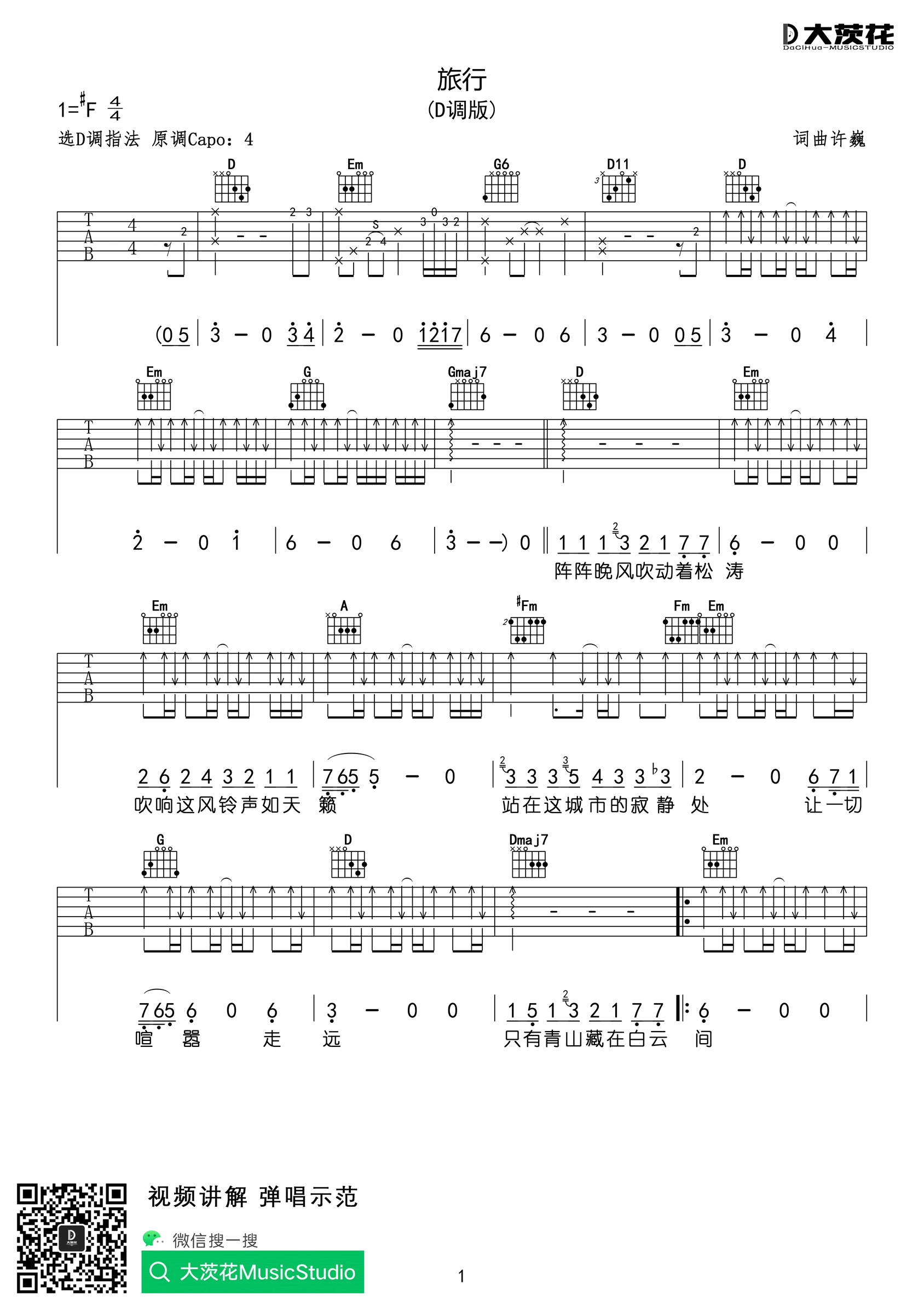 《许巍《旅行吉他谱》(D调)》内容来自于互联网,不能保证内容的准确性与完整性,仅供学习交流欣赏,请勿用于其它用途,内容版权归原作者及来源网站所有,如有侵犯到您的权益请来信告知,我们将及时删除。