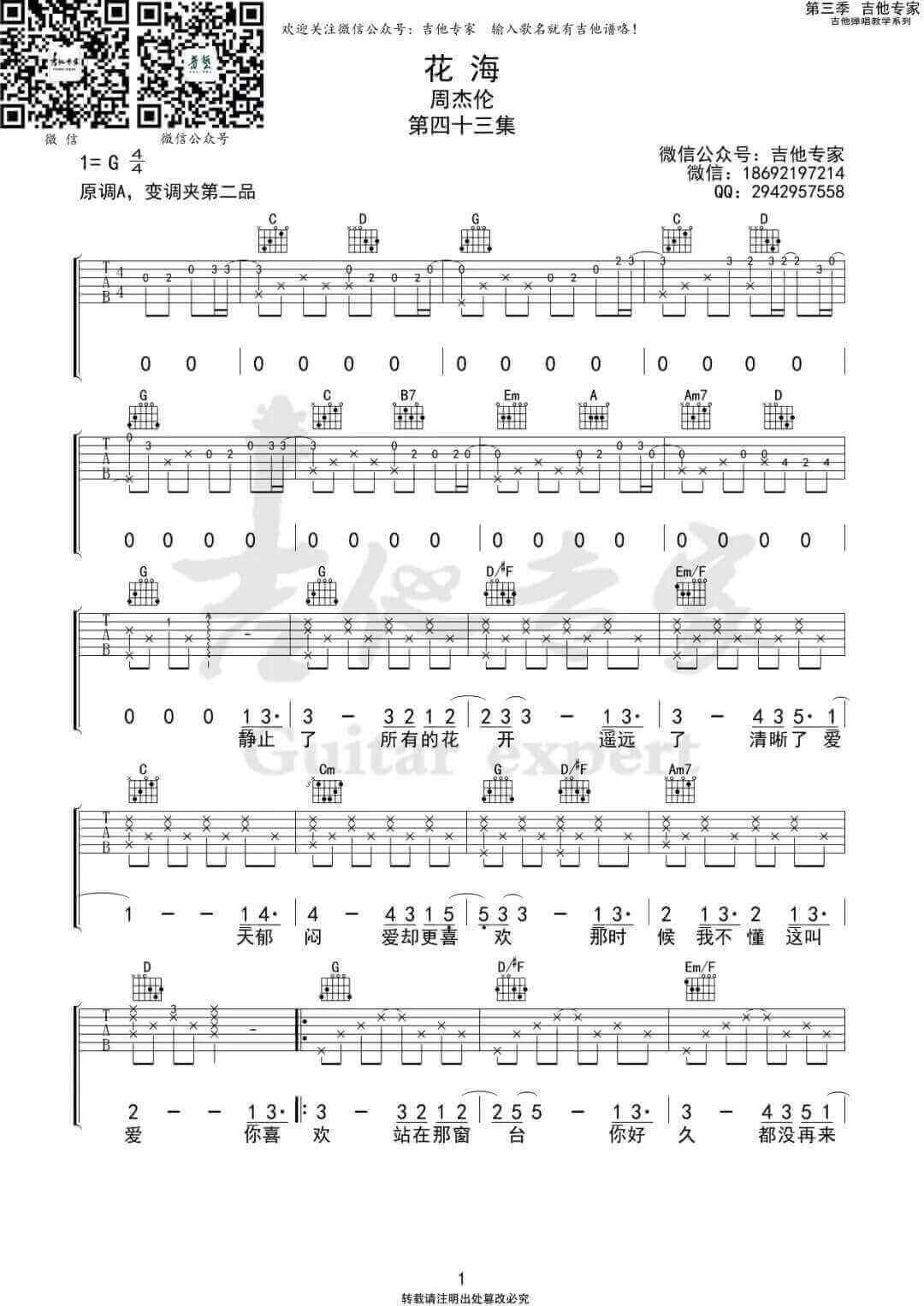 《周杰伦《花海吉他谱》(G调)》内容来自于互联网,不能保证内容的准确性与完整性,仅供学习交流欣赏,请勿用于其它用途,内容版权归原作者及来源网站所有,如有侵犯到您的权益请来信告知,我们将及时删除。