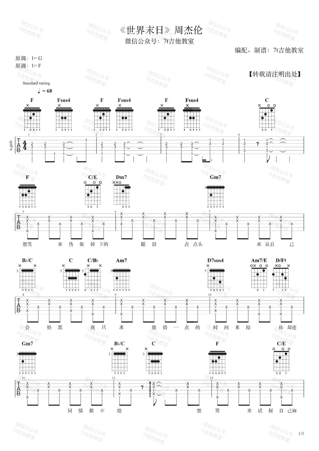 《周杰伦《世界末日吉他谱》(F调)》内容来自于互联网,不能保证内容的准确性与完整性,仅供学习交流欣赏,请勿用于其它用途,内容版权归原作者及来源网站所有,如有侵犯到您的权益请来信告知,我们将及时删除。