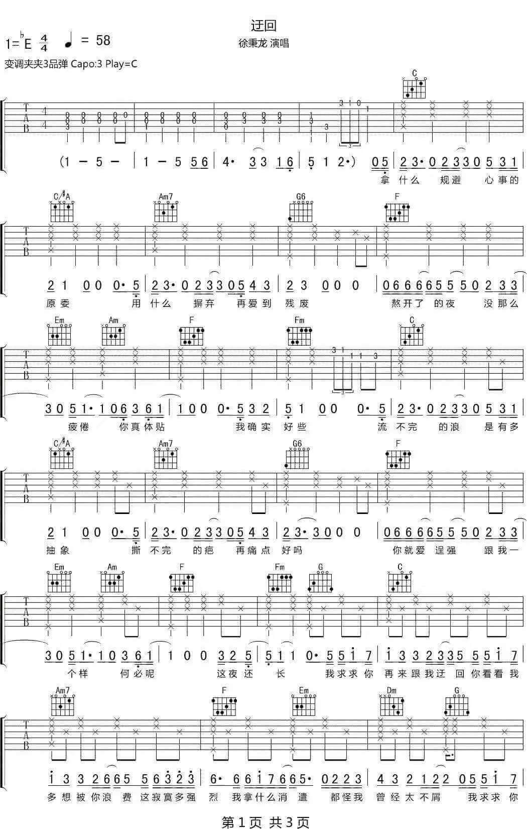《徐秉龙《迂回吉他谱》(C调)》内容来自于互联网,不能保证内容的准确性与完整性,仅供学习交流欣赏,请勿用于其它用途,内容版权归原作者及来源网站所有,如有侵犯到您的权益请来信告知,我们将及时删除。