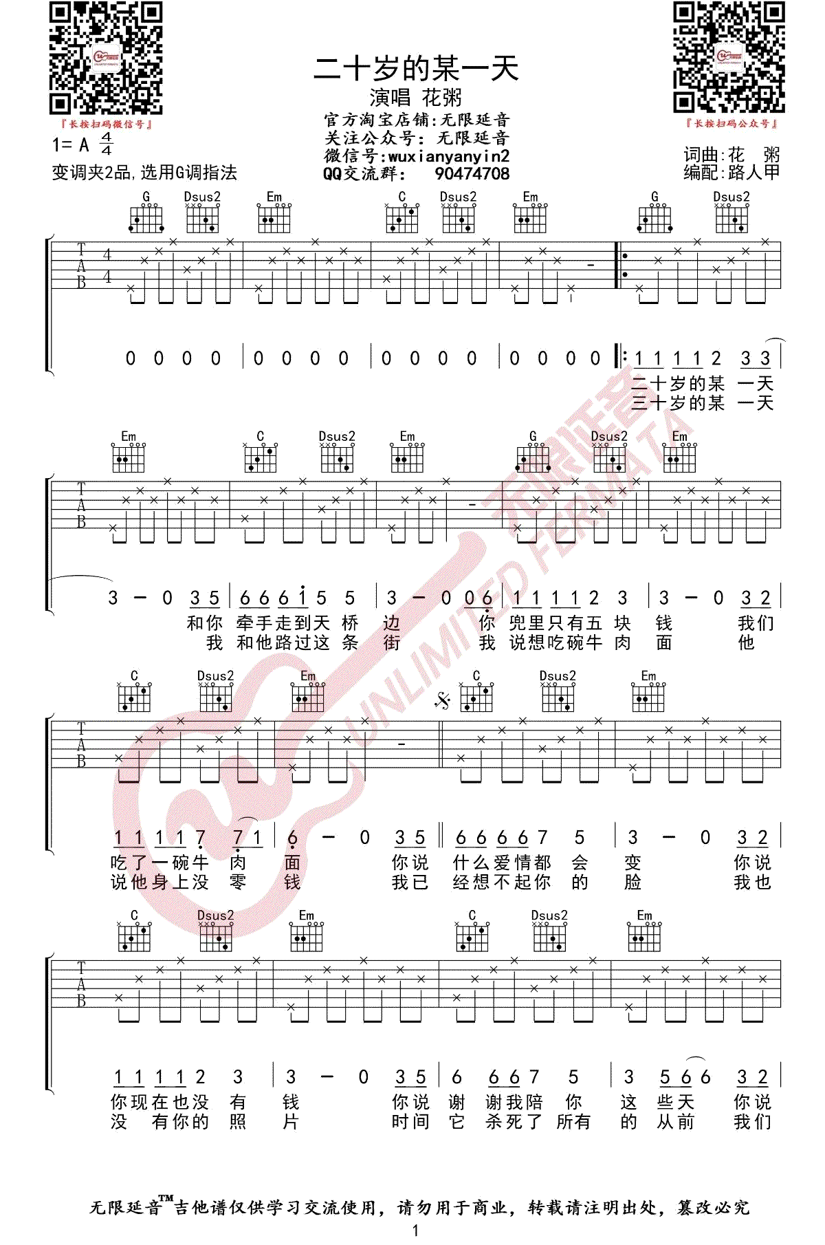 《花粥《二十岁的某一天吉他谱》》内容来自于互联网,不能保证内容的准确性与完整性,仅供学习交流欣赏,请勿用于其它用途,内容版权归原作者及来源网站所有,如有侵犯到您的权益请来信告知,我们将及时删除。