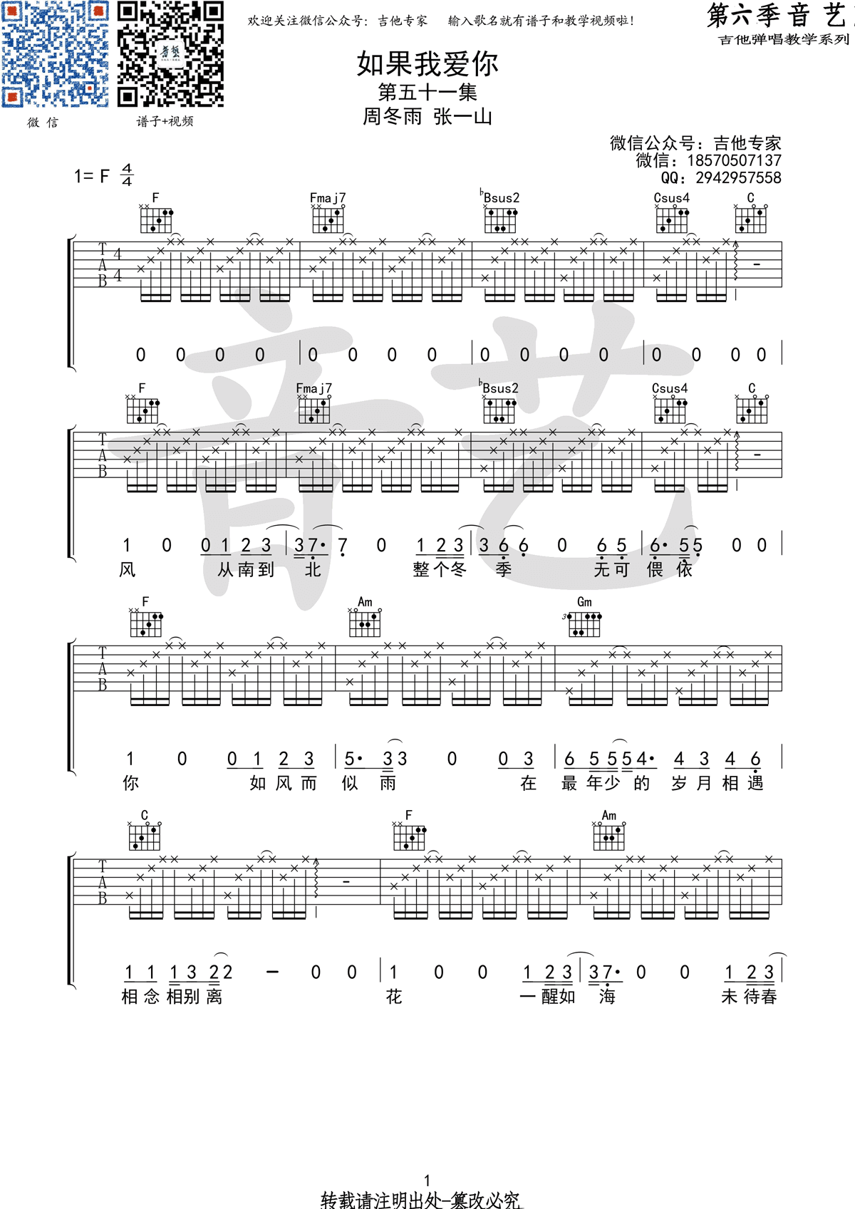 《张一山《如果我爱你吉他谱》(F调)》内容来自于互联网,不能保证内容的准确性与完整性,仅供学习交流欣赏,请勿用于其它用途,内容版权归原作者及来源网站所有,如有侵犯到您的权益请来信告知,我们将及时删除。