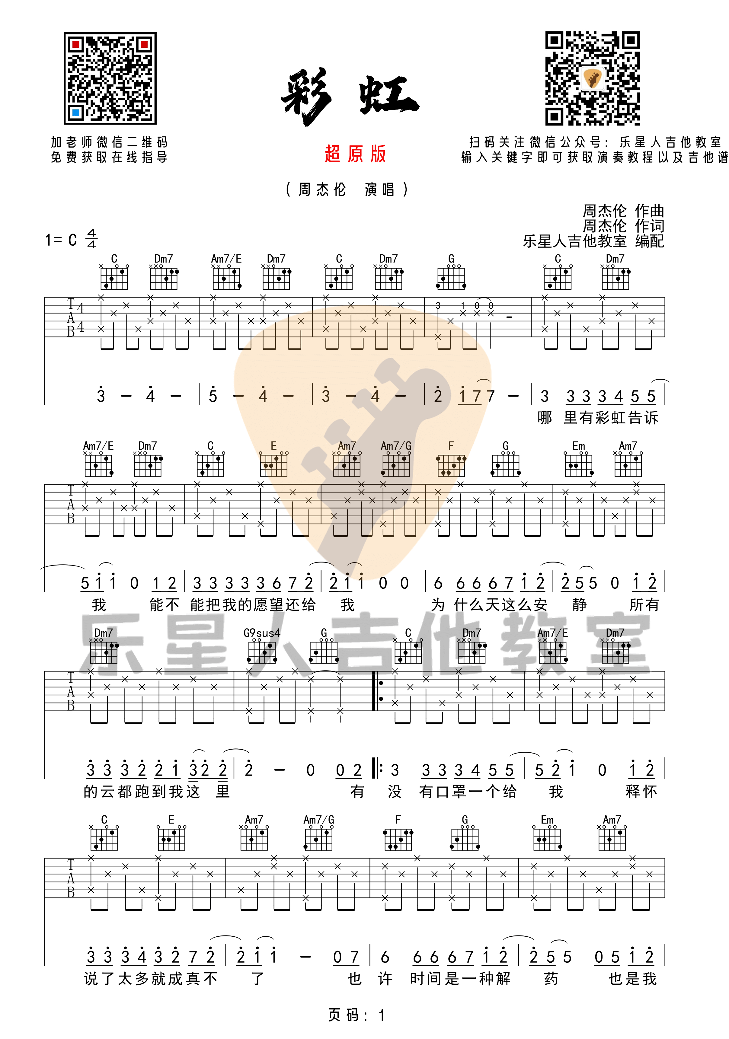 《周杰伦《彩虹吉他谱》(C调)》内容来自于互联网,不能保证内容的准确性与完整性,仅供学习交流欣赏,请勿用于其它用途,内容版权归原作者及来源网站所有,如有侵犯到您的权益请来信告知,我们将及时删除。
