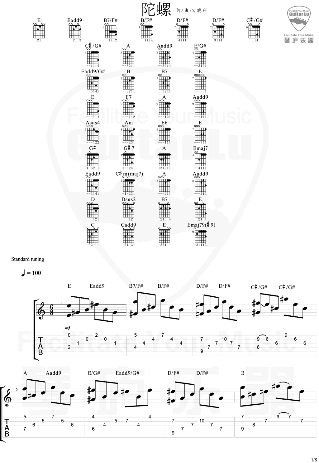 《陀螺》是由万晓利创作并演唱的一首民谣歌曲,以E调为原版编排。歌曲通过丰富的环境音效如晨钟、鸽哨、鸟鸣等,以及细腻的歌词描绘出许多生活细节,反映了作者身不由己的体验。歌曲以点题的方式,深情地表达了许多心酸与无奈。这个版本的吉他谱采用E调指法原版编排,和弦较多,