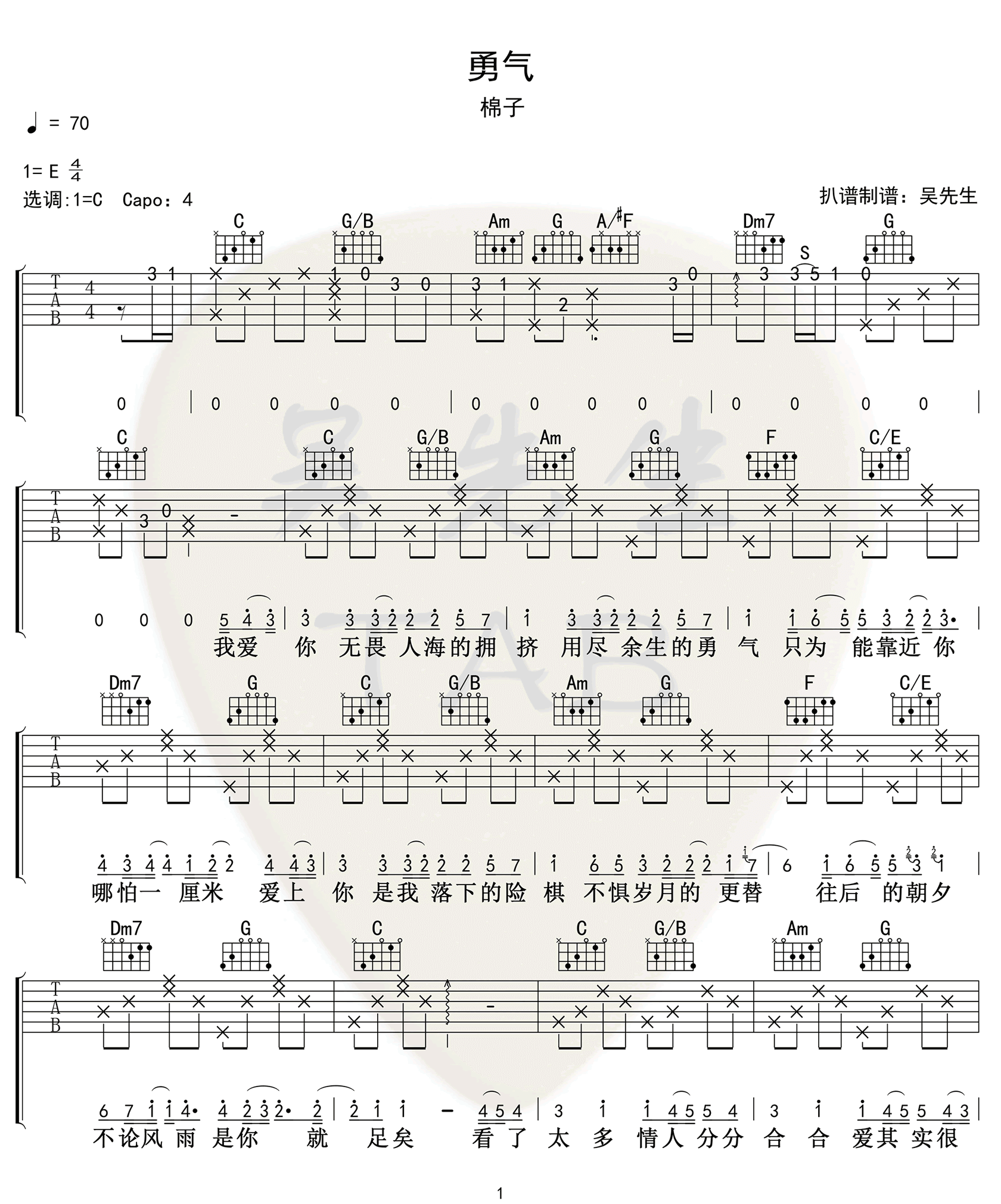 棉子演唱的《勇气》是一首近期在网络上广受欢迎的歌曲。初看歌名,我误以为是梁静茹的翻唱,但实际上并非如此。吴先生扒谱制谱,将原调为E调的歌曲改编成了C调,演唱时通过夹变调夹4品回到原调。这首歌的编配难度不高,前奏和间奏部分带有一些旋律音,而后面的节奏和和弦则相对