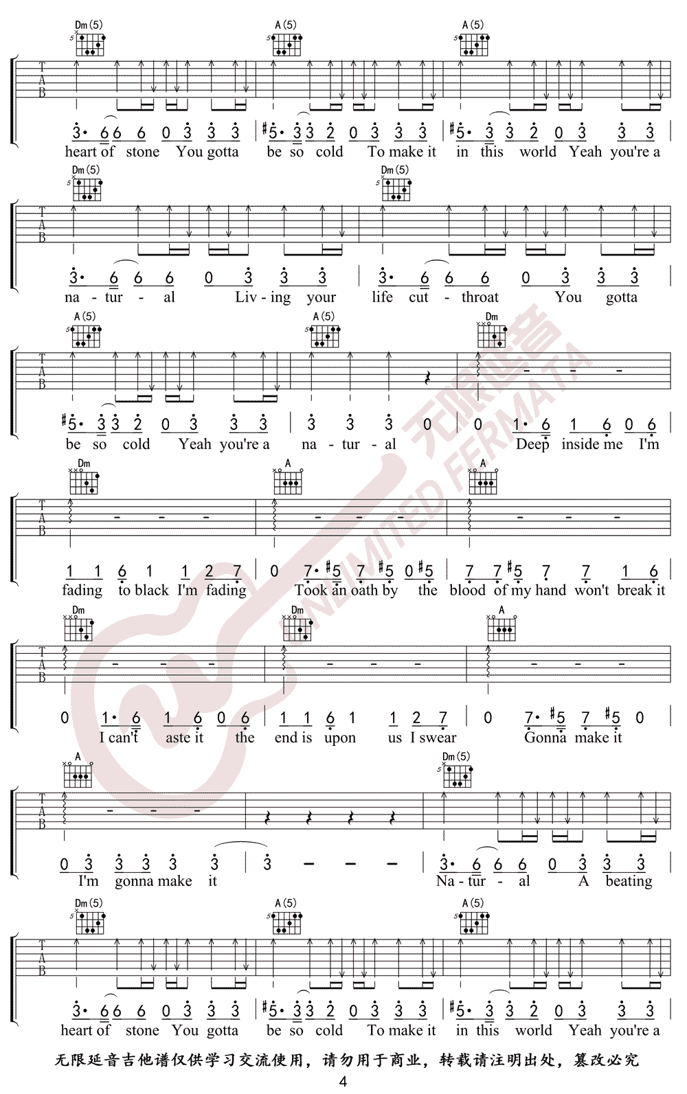 Imagine Dragons演唱的《Natural》是一首励志歌曲,风格硬朗黑暗,充满力量。梦龙骑士的声音独特迷人,配以磅礴的鼓点,歌曲更显气势燃炸。这份吉他谱采用F调指法,编配源自无限延音扒谱制谱,保持了原版的精髓。在演唱时,根据实际情况可以使用变调夹。值