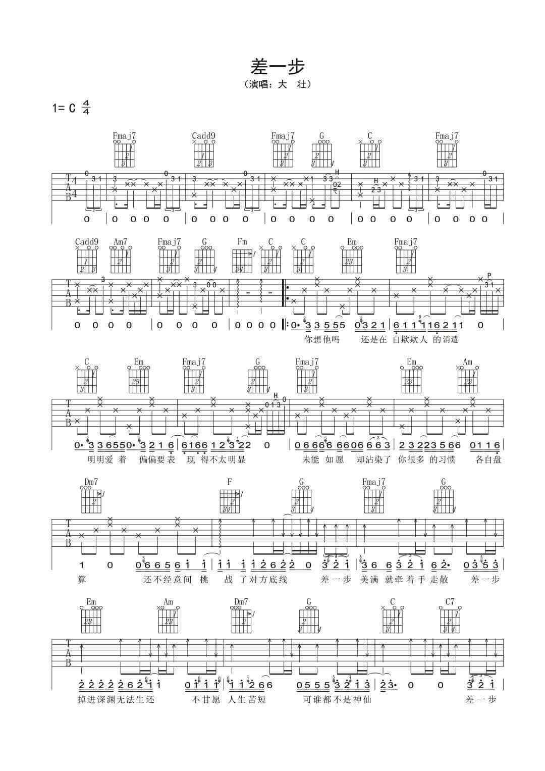 《大壮《差一步吉他谱》(C调)》内容来自于互联网,不能保证内容的准确性与完整性,仅供学习交流欣赏,请勿用于其它用途,内容版权归原作者及来源网站所有,如有侵犯到您的权益请来信告知,我们将及时删除。