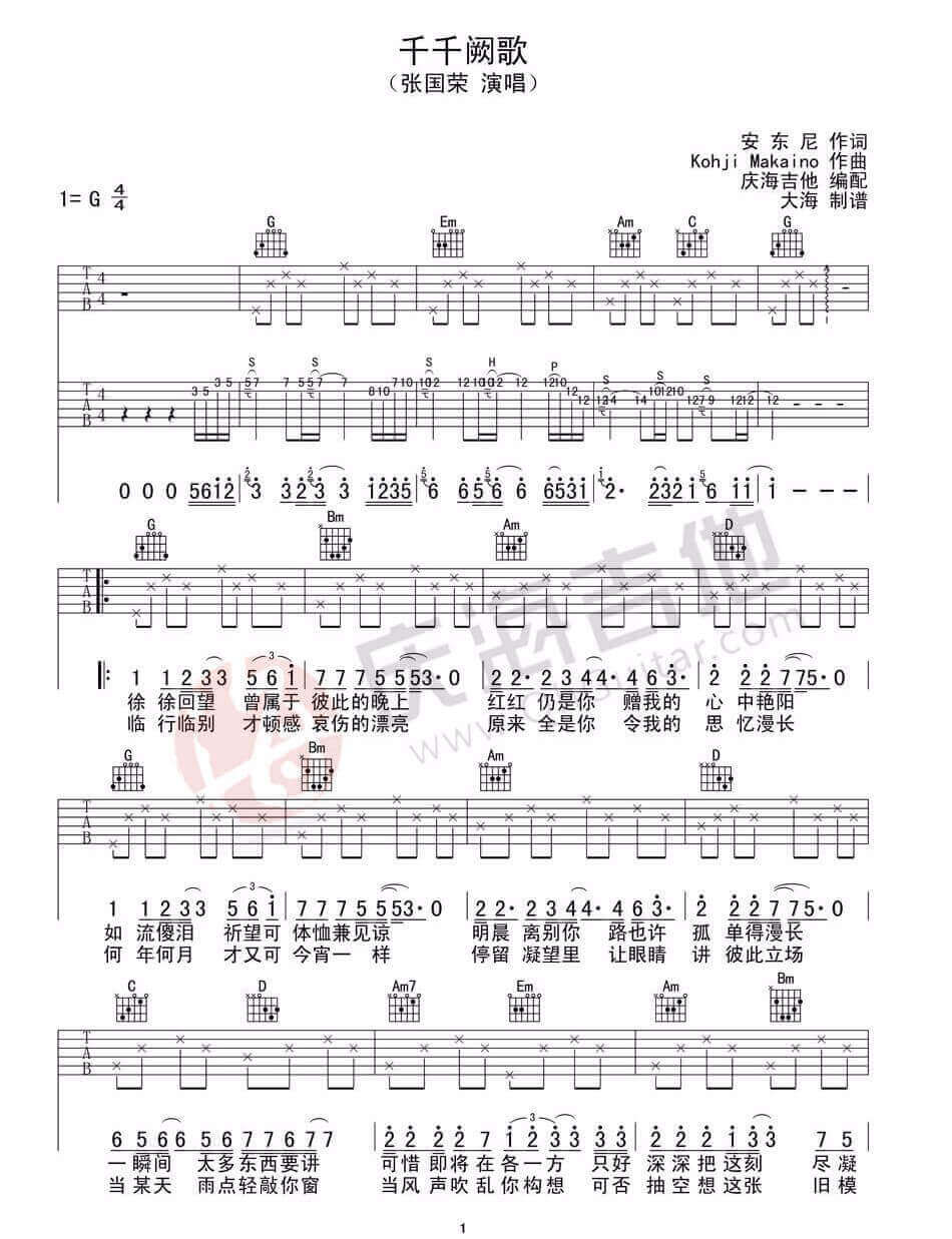 《陈慧娴《千千阙歌吉他谱》(G调)》内容来自于互联网,不能保证内容的准确性与完整性,仅供学习交流欣赏,请勿用于其它用途,内容版权归原作者及来源网站所有,如有侵犯到您的权益请来信告知,我们将及时删除。