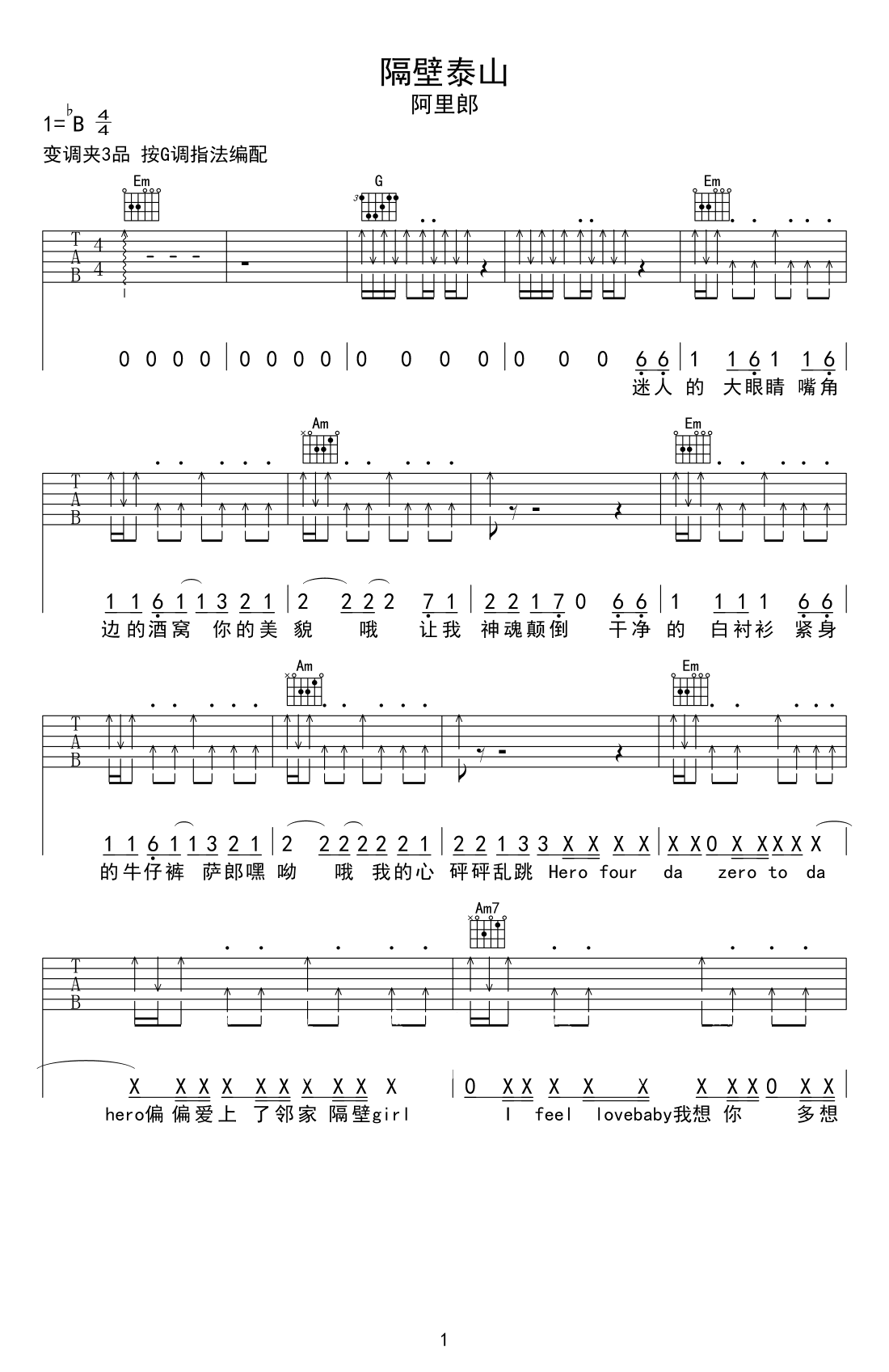 《隔壁泰山吉他谱》(G调)